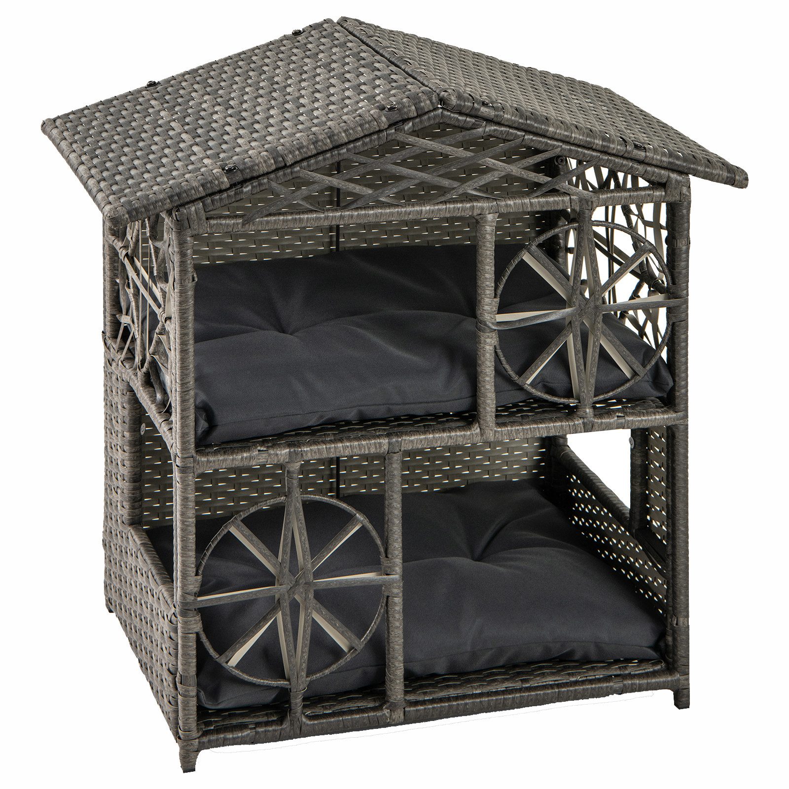 Suchen Sie nach einem stilvollen Katzenhaus, das Ihrem pelzigen Freund ein gemütliches und komfortables Zuhause bietet? Dieses Premium PE-Rattan 2-stöckige Katzenkondominium ist die perfekte Lösung. Sorgfältig aus hochwertigem PE-Rattan gefertigt, bietet es jedem Raum eine natürliche und elegante Note. Die farbbeständigen und verschleißfesten Eigenschaften sorgen dafür, dass es jahrelang schön und zuverlässig bleibt. Darüber hinaus ist jede Ebene des Katzenkondominiums mit einem abnehmbaren weichen Kissen ausgestattet, das mit ausgewählter PP-Baumwolle gefüllt ist und Ihren Katzen einen äußerst bequemen Platz zum Schlafen und Entspannen bietet. Die Reißverschlussbezüge erleichtern die Reinigung.