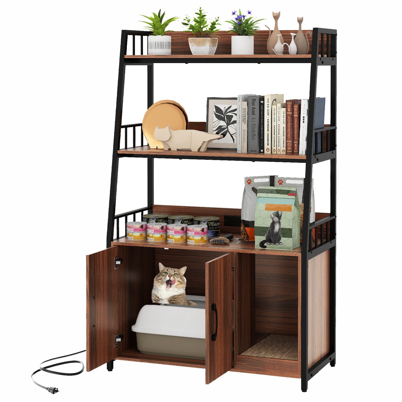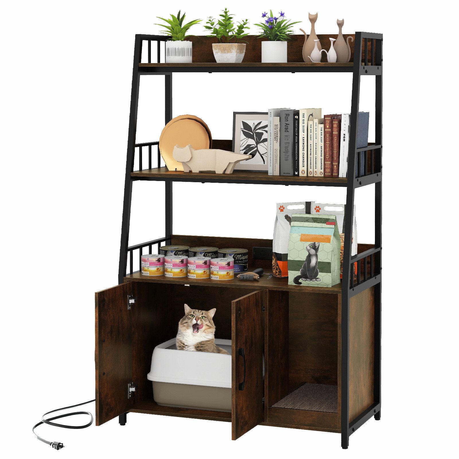 Suchen Sie nach einer vielseitigen und praktischen Katzenmöbellösung? Unser multifunktionaler Katzenschrank bietet einen privaten und komfortablen Raum für Ihren Katzenfreund. Der vielseitige Unterschrank kann als Katzen-Toilettenabdeckung oder gemütliche Katzenhöhle genutzt werden. Die praktische Ladestation mit 2 Steckdosen, 1 USB-Anschluss und 1 Typ-C-Anschluss ermöglicht es Ihnen, Ihr Telefon, Ihren Laptop und andere Geräte aufgeladen zu halten. Darüber hinaus bieten die 3-stufigen offenen Regale reichlich Stauraum für Tierbedarf, Dekorationen, Bücher, Spielzeug und mehr.
