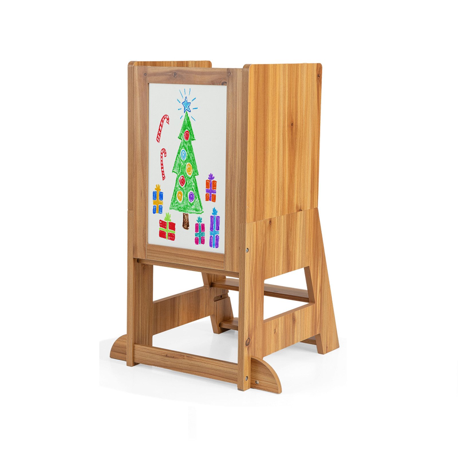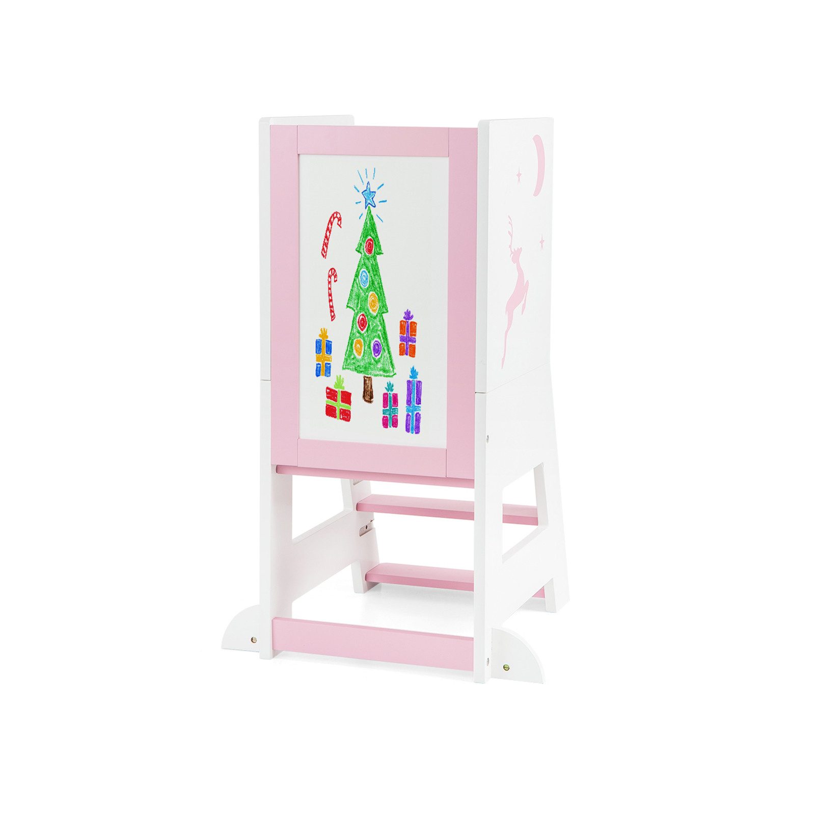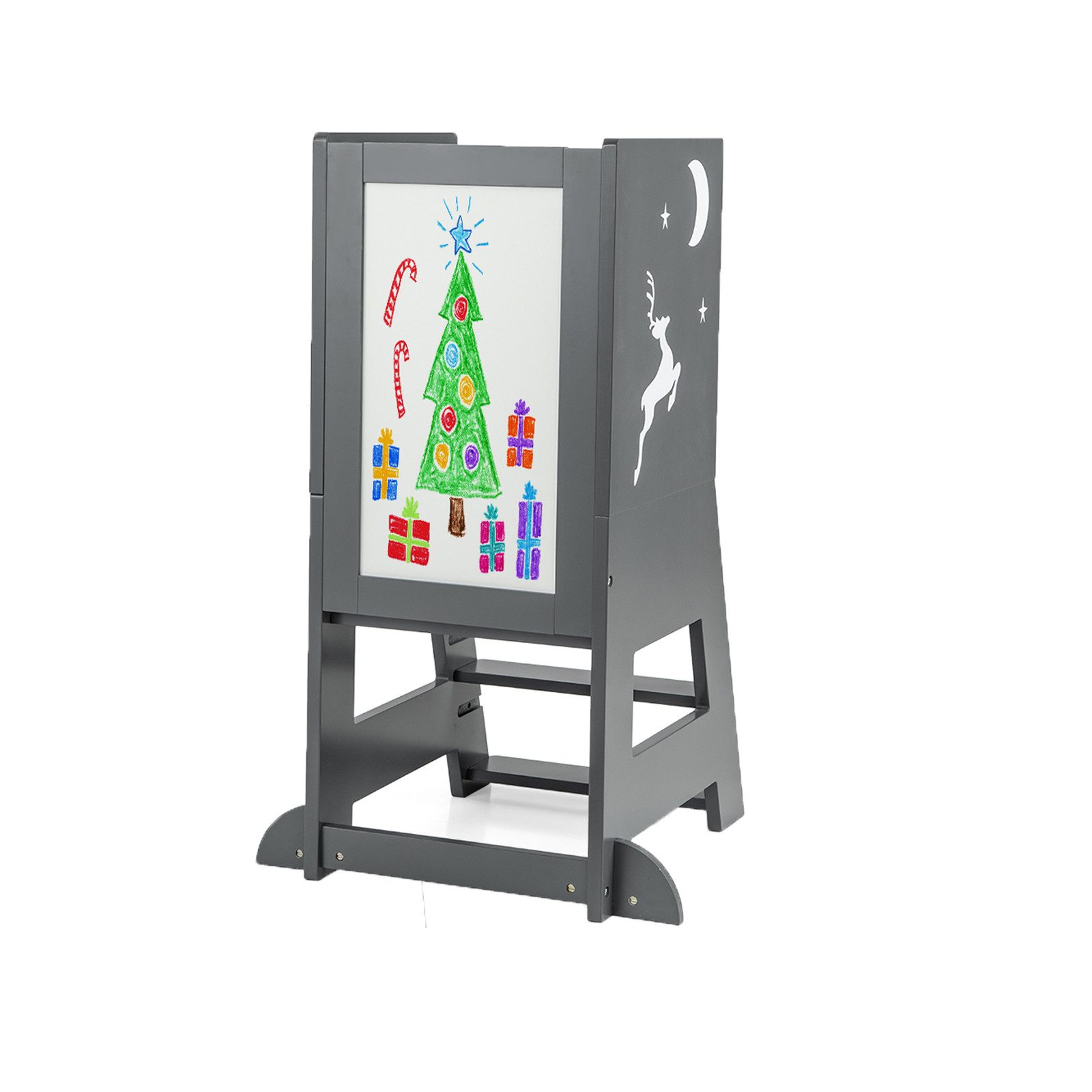 (мы ещё работаем над переводом, извините за неудобство): Die Unabhängigkeit Ihrer Kinder beginnt mit unserem Tritthocker! Dieser Stehturm mit dreistufig verstellbarer Plattform und Stufe ist für Kinder im Alter von 1 bis 7 Jahren geeignet und hebt Ihr Kleines auf eine höhere Position, um es bei alltäglichen Aktivitäten zu unterstützen. Kinder können lernen, selbstständig Hände und Gesicht zu waschen oder Zähne zu putzen. Mit Whiteboard, Tafel und Stiften können Kinder schreiben oder zeichnen und so ihre Kindheit unterhaltsamer gestalten. Der Kinder-Tritthocker besteht aus strapazierfähigem MDF mit stabilen Schrauben und ist auf Langlebigkeit ausgelegt. Im Gegensatz zu anderen Modellen ohne Kippschutzfüße ist unser Modell für zusätzliche Stabilität und Sicherheit mit zwei davon ausgestattet. Zum Glück bricht das abnehmbare Holzgeländer nicht so leicht, was effektiv verhindert, dass Kinder herunterfallen. Eltern können das Holzgeländer auch entfernen und das Produkt als Leiter verwenden. Der Kleinkind-Hilfsturm ist daher zuverlässig und vielseitig zu verwenden.