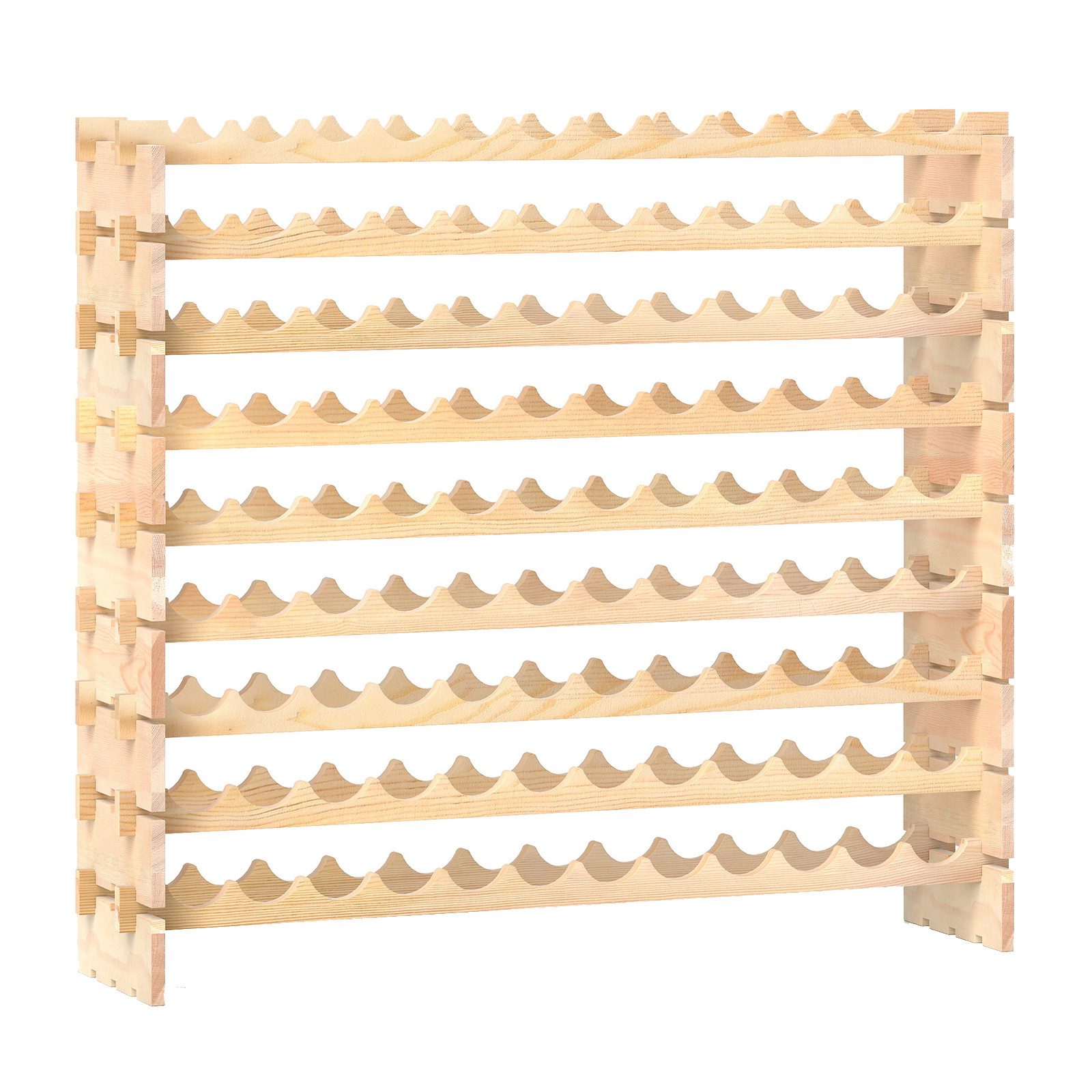 Unser Weinregal aus Kiefernholz hat ein stapelbares Design mit 9 Ebenen und bietet Platz für bis zu 108 Weinflaschen. Dank des offenen Designs können Sie den Wein jederzeit genießen, während die horizontale Struktur eine optimale Frische Ihrer Sammlung sicherstellt. Sorgen Sie sich um mögliche Erschütterungen und Schäden an den Flaschen? Die gewellten Fächer sind die perfekte Lösung, um jede Flasche Ihrer wertvollen Weinsammlung zu schützen. Unser elegantes Weinregal vereint Stil und Funktionalität, die jeder Weinsammler lieben wird!