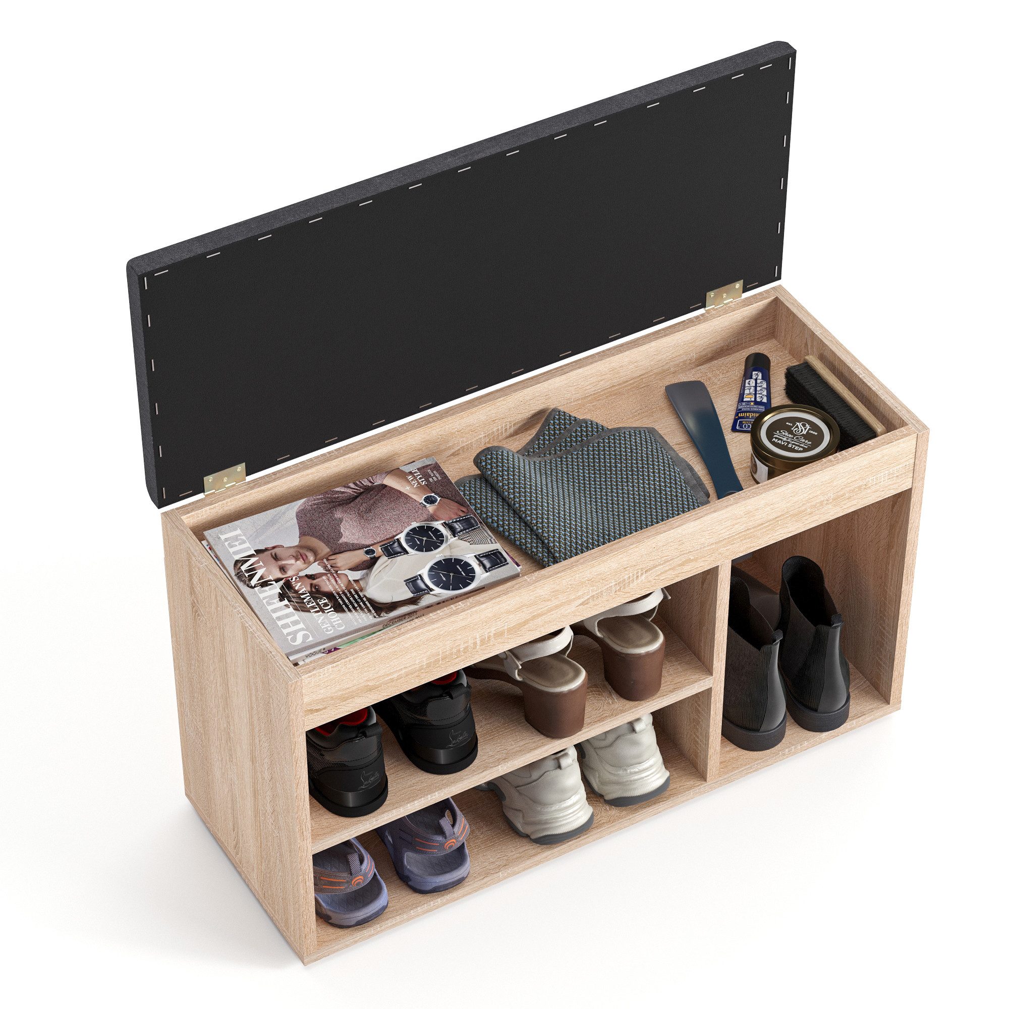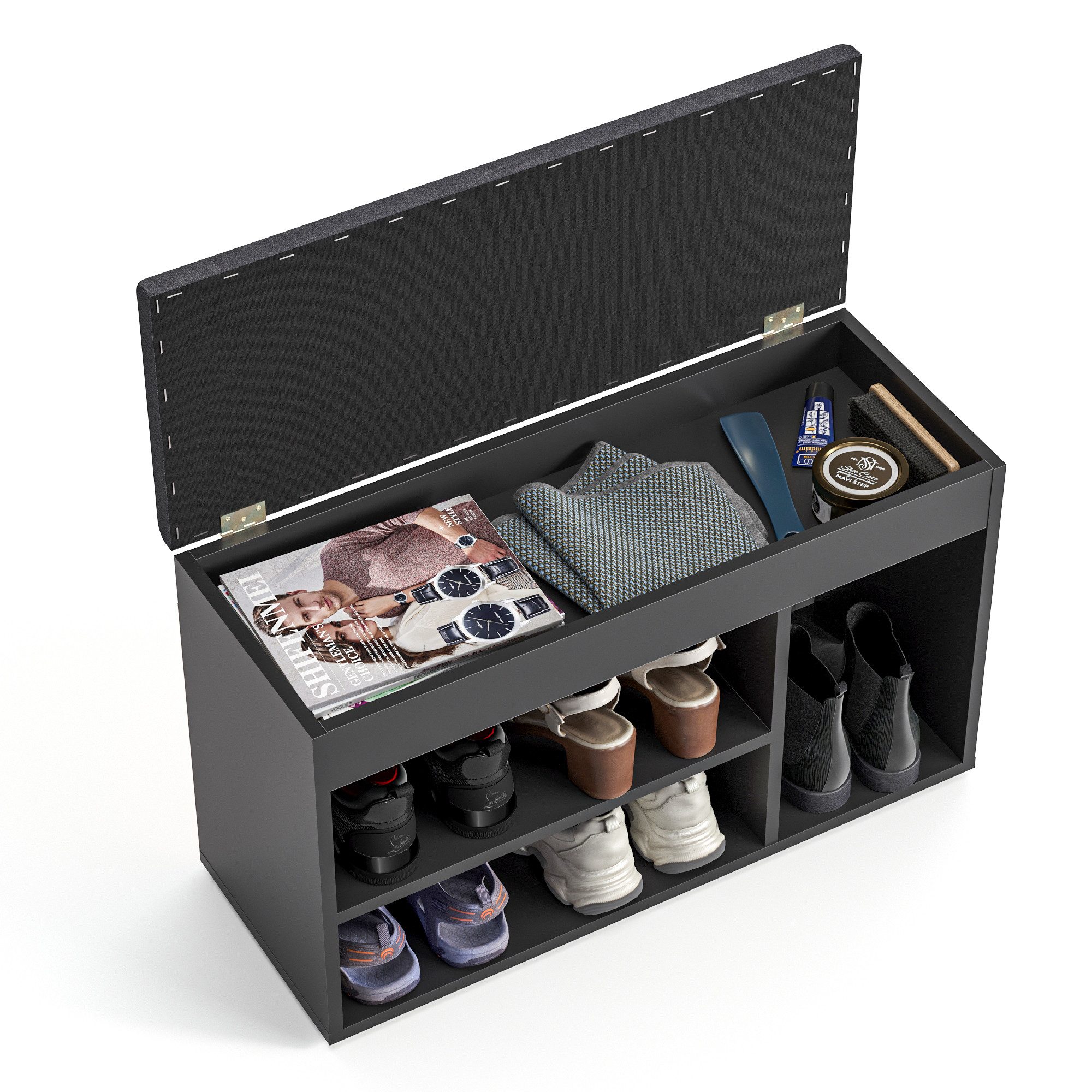 Der Aufbau hat trotz fehlender Anleitung keine Stunde gedauert und unter dem Deckel ist reichlich Platz für Schal, Mütze, etc und sogar den Regenschirm.