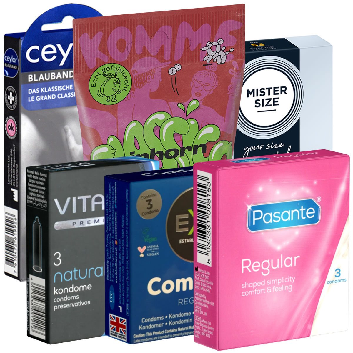 Hinweise | Kondome aus Naturkautschuk-Latex sollten nicht von Personen verwendet werden, die eine Всеrgie gegen Latex haben oder deren Haut empfindlich auf den Kontakt mit Latex reagiert. Kondome sollten kühl, trocken und vor Hitze sowie direkter Sonneneinstrahlung geschützt aufbewahrt werden. Nach dem auf der Umverpackung oder der Siegelfolie angegebenen Datum sollten Sie das Kondom nicht mehr benutzen. Kein Verhütungsmittel kann einen 100%igen Schutz gegen die Ansteckung mit sexuell übertragbaren Krankheiten oder vor Empfängnis bieten. Gebrauchte Kondome gehören in den Abfall, nicht in die Toilette oder in die Landschaft. Wenn Sie Gleitmittel benutzen möchten, achten Sie darauf, nur kondomgeeignete Mittel zu benutzen., Achtung: Medizinprodukt Achtung: Bedienungsanleitung lesen Achtung: Enthält Latex Achtung: Keiner direkten Sonneneinstrahlung aussetzen Achtung: Nicht benutzen, wenn die Verpackung beschädigt ist Achtung: Vor Feuchtigkeit schützen Achtung: Zur einmaligen Verwendung |