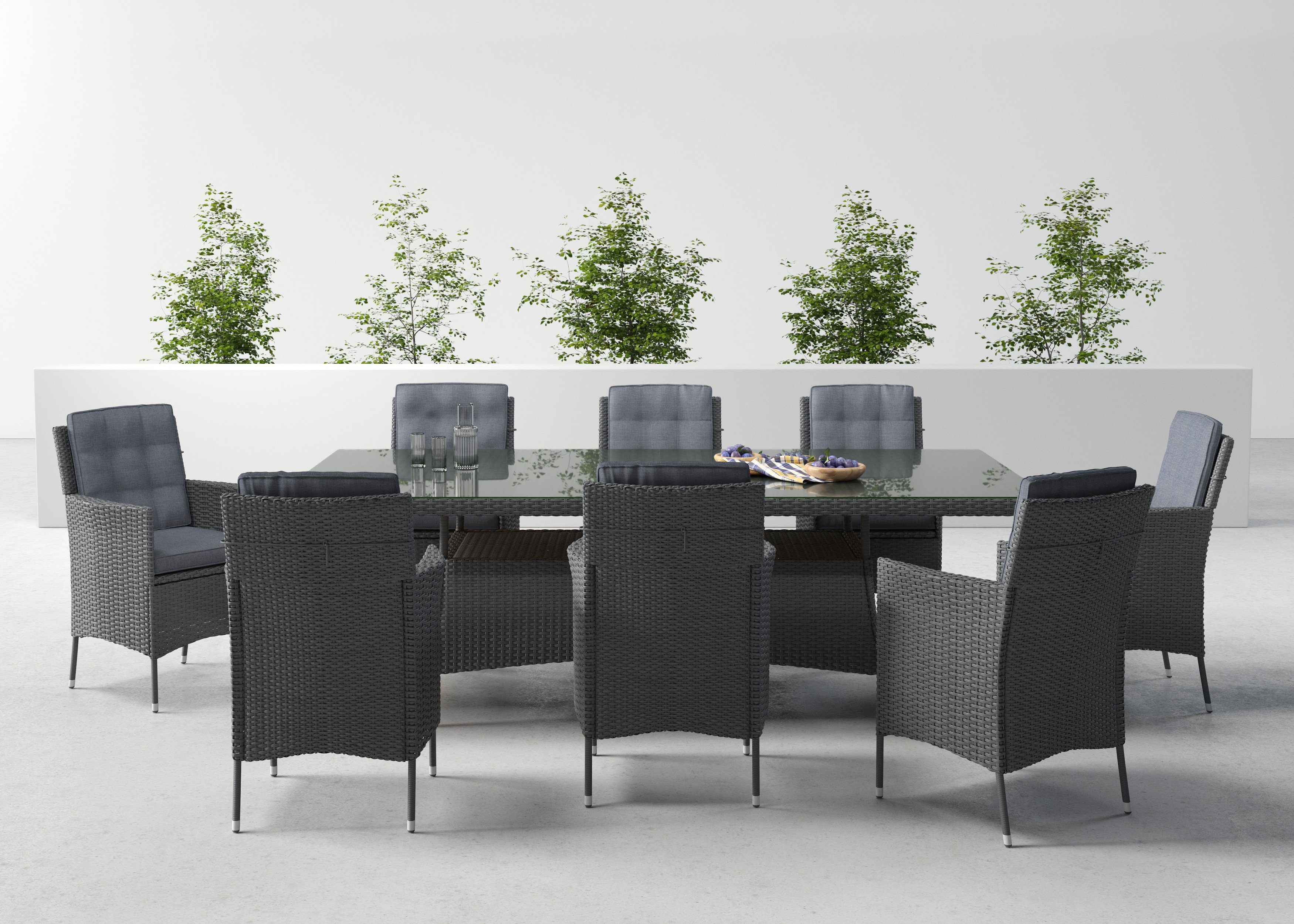 Set beinhaltet | 1x Tisch, 8x Sessel, 8 x Auflage, 1x Schutzhülle |