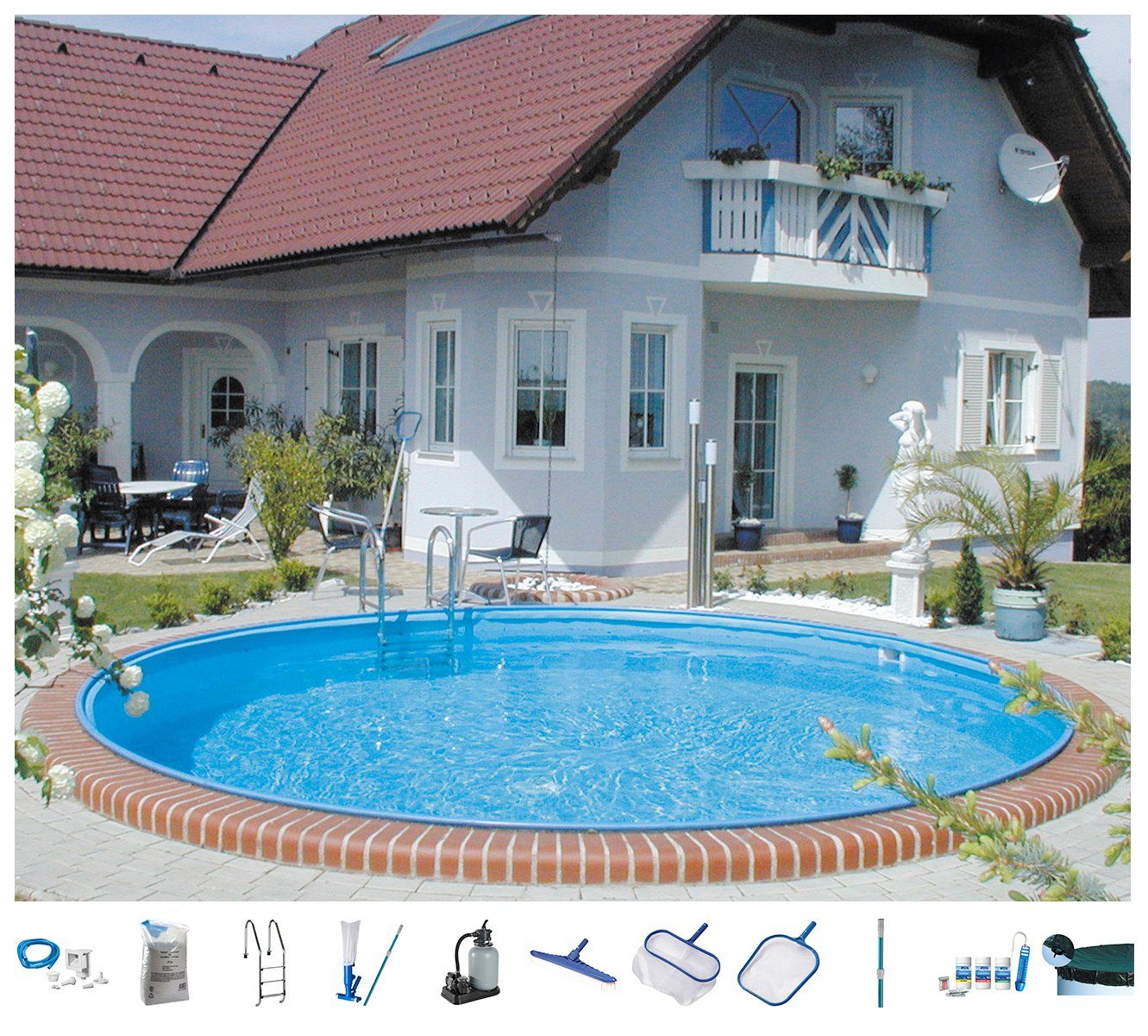 Lieferumfang | Abdeckplane Quarzsand Reiniger-Set Sandfilteranlage Skimmerpaket Stahlwandmantel inkl. Montagezubehör Tiefbeckenleiter aus Edelstahl Wasserpflege-Set manueller Poolbodensauger Magic |