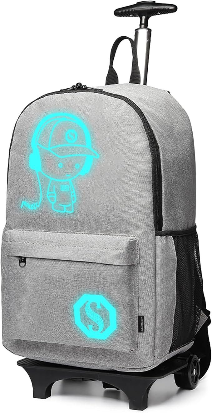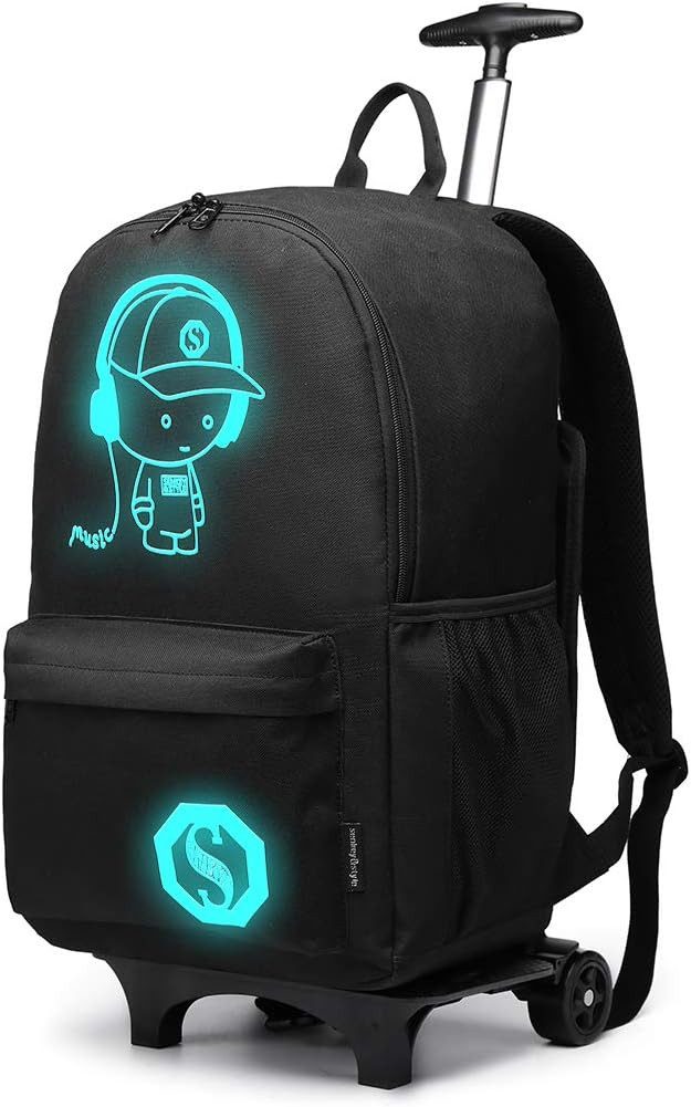 Nachtleuchtend: Leuchtender Trolley-Laptop-Rucksack für Männer und Frauen, nachdem sie Licht absorbiert haben.