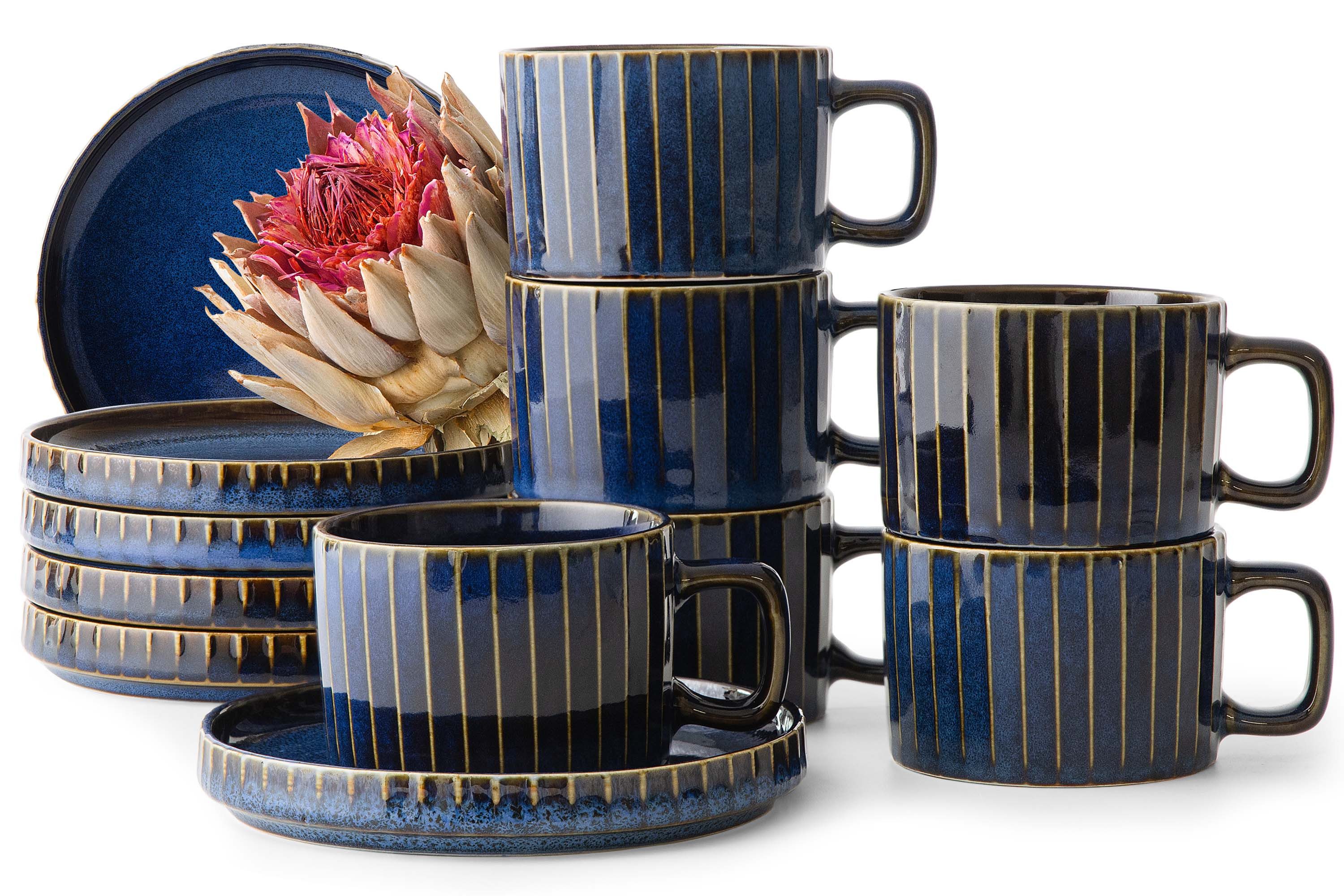 Inspiriert von den neuesten Trends, begeistert sie durch das individuelle Design jedes einzelnen Elements. Dank der außergewöhnlichen Technik der reaktiven Glasur wird jedes Element der Kollektion zu einem kleinen Kunstwerk – der Brennvorgang erzeugt einzigartige Muster und Schattierungen, die sich nie wiederholen und jedem Element einen unverwechselbaren Charakter verleihen. Ein zusätzlicher Akzent sind die handbemalten schwarzen und braunen Kanten, die einen subtilen Hauch von künstlerischer Eleganz verleihen und die Sorgfalt der Verarbeitung unterstreichen.