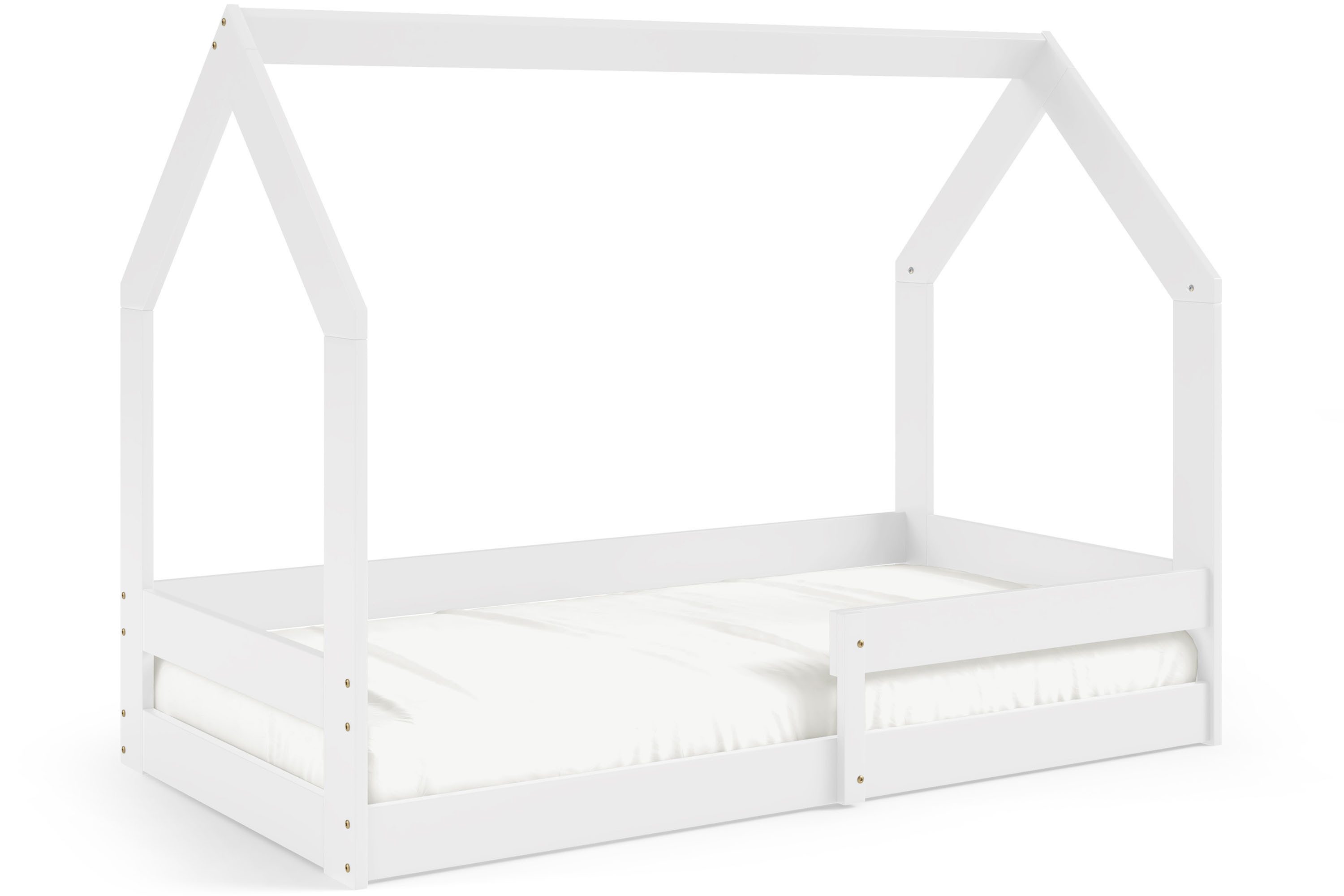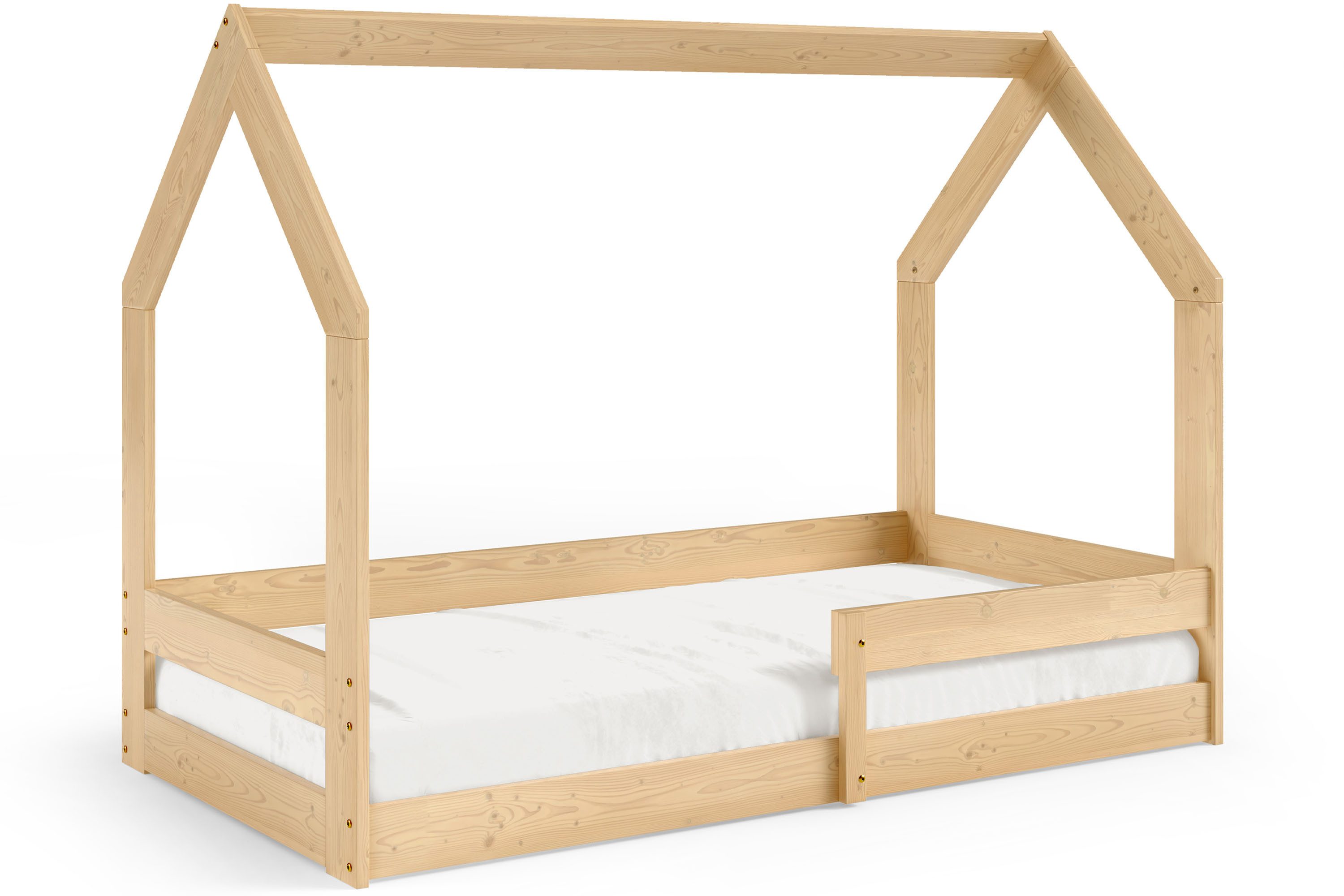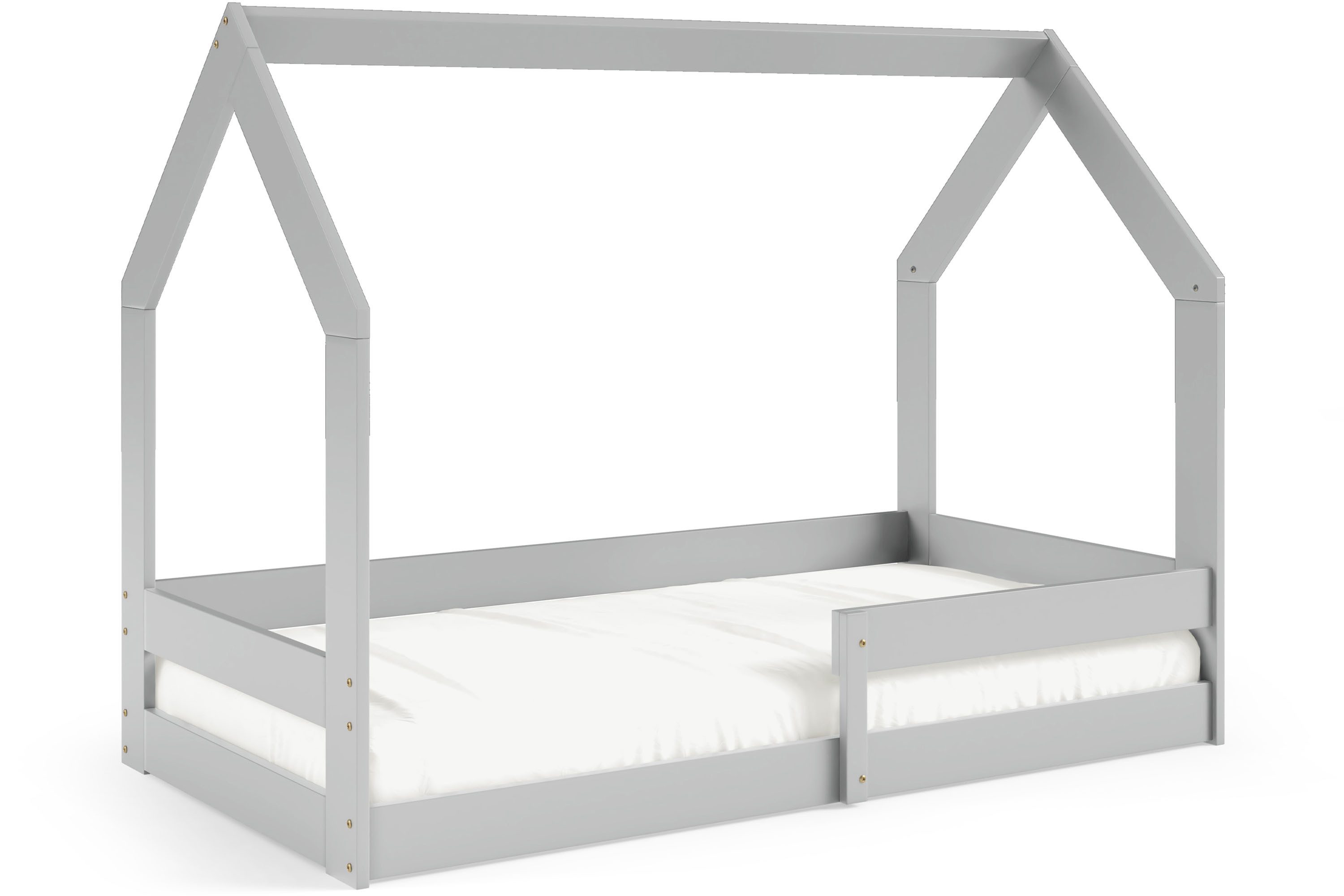 Einzigartig in der LUMBE-Kollektion sind die Betten in Hüttenform, die ein spielerisches Element einbringen und einen stilvollen Akzent im Kinderzimmer setzen. Die Betten sind in drei Farben erhältlich: Naturholz, Grau, das modern und vielseitig ist, und Weiß, das der Einrichtung Frische und Helligkeit verleiht.