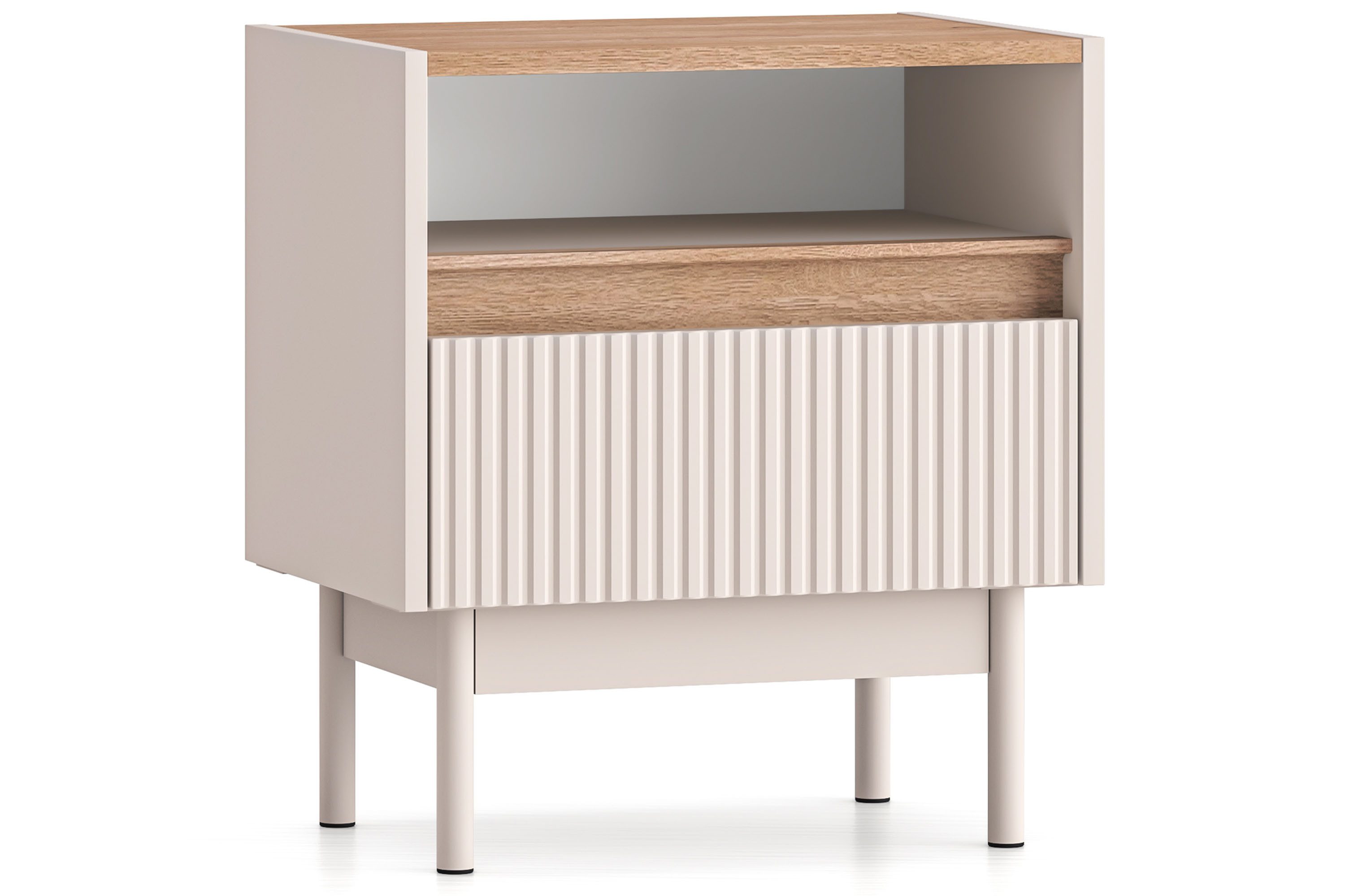 Die Kollektion NALIA ist die Quintessenz minimalistischer Eleganz, übertragen in den Wohnbereich. Der dezente Kaschmirfarbton der Fronten harmoniert perfekt mit den warmen Eichenholz-Einlagen und schafft eine geschmackvolle Kombination, die dem Raum Wärme verleiht und gleichzeitig eine moderne Leichtigkeit bewahrt.