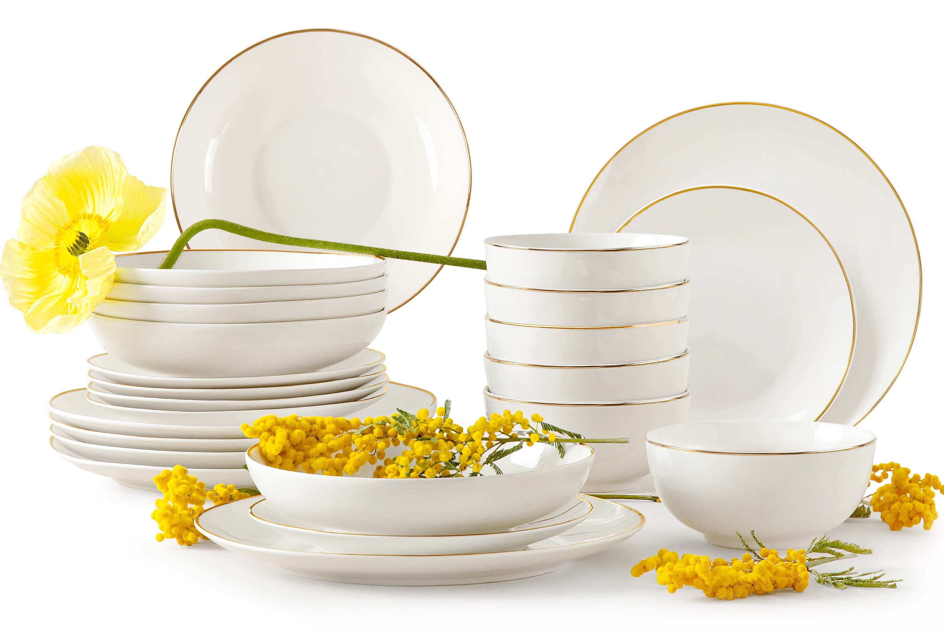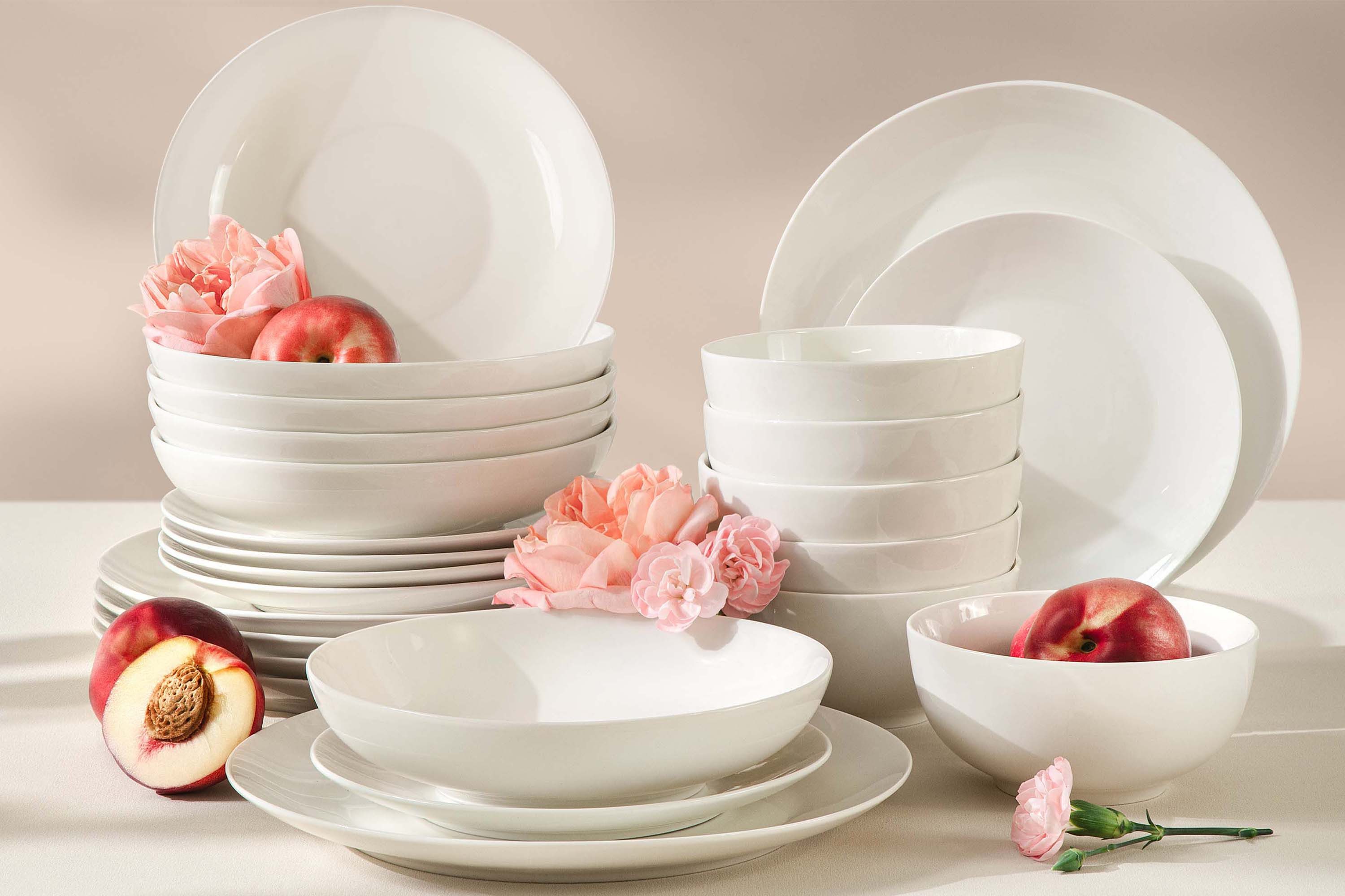 6x Speiseteller Ø26 cm | h 2,5 cm 6x Suppenteller Ø20 cm | h 5 cm | 900 ml 6x Dessertteller Ø20 cm | h 2,3 cm 6x Schüssel ⌀14 cm | h 7 cm | 630 ml