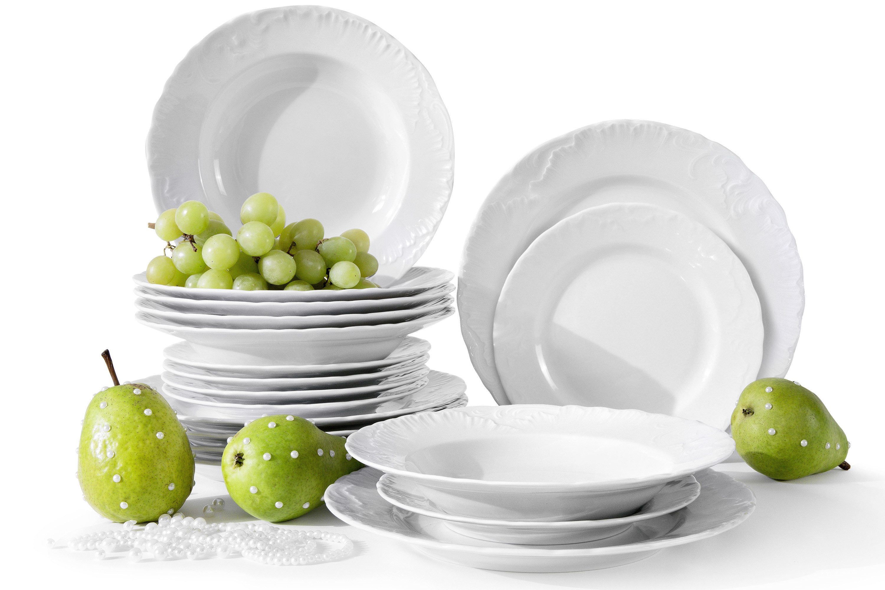 Entdecken Sie die außergewöhnliche ROCOCO-Porzellankollektion, die für alle geschaffen wurde, die höchste Qualität, klassische Eleganz und Liebe zum Detail schätzen. Jedes Teil des Sets ist aus weißem Porzellan mit dezenten Dekoren gefertigt, die ihm einen edlen und zeitlosen Charakter verleihen. Diese Art von Geschirr kommt nie aus der Mode, und seine minimalistische, aber raffinierte Ästhetik fügt sich perfekt in jeden Einrichtungsstil ein.