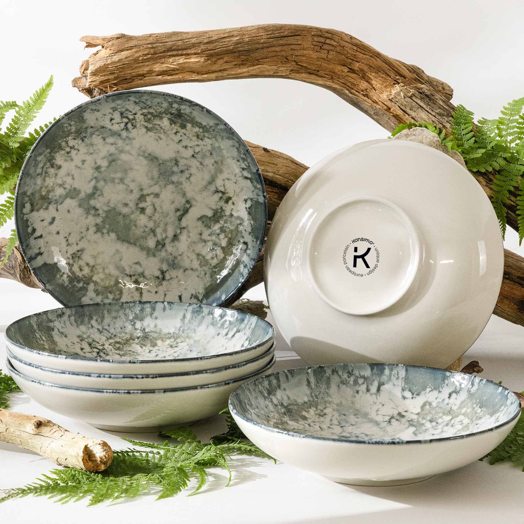 Das von der Natur inspirierte Design verleiht ihnen einen einzigartigen Charakter, der an ruhige Landschaften und organische Muster erinnert. Dezente, natürliche Farben und zarte Muster, die an Wasserflecken erinnern, bilden ein harmonisches Ganzes, das sich perfekt in jedes Tischbild einfügt. Jedes Stück der Kollektion wurde sorgfältig entworfen und gefertigt, um das Auge zu erfreuen und jede Mahlzeit mit Charme zu bereichern.