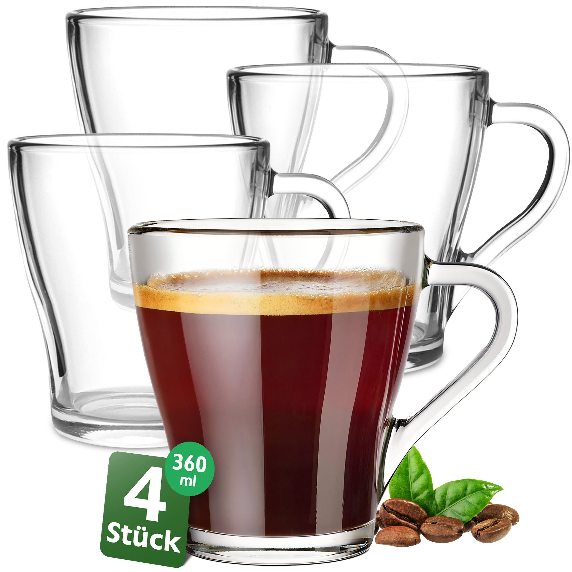 Transparente Kaffeegläser mit Henkel 360 ml Kaffeetassen aus Glas Set 4 o. 6 Stk. Spülmaschinenfest