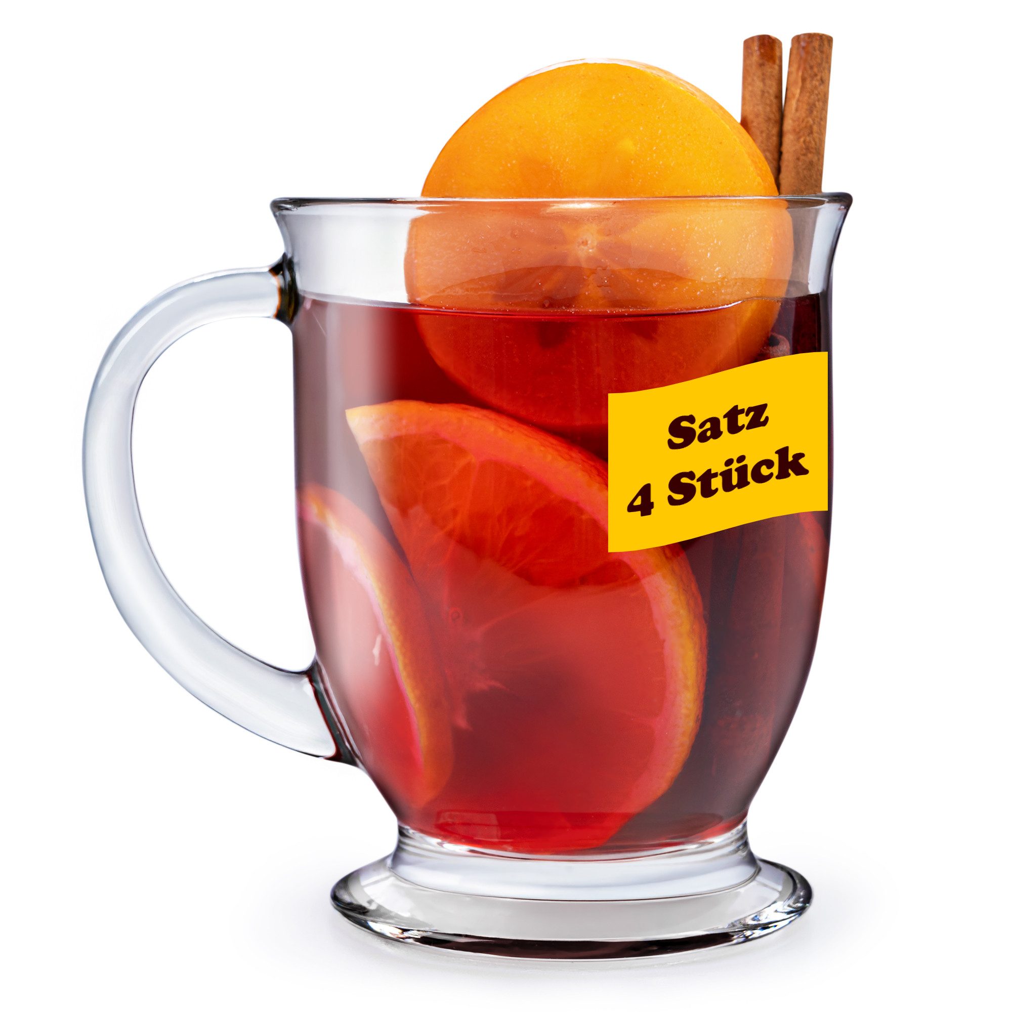 Die Teebecher werden in günstigen Sets erhältlich pro 4 oder 6 Stück. Die 400 ml Gläser mit Henkel können zu verschiedenen Zwecken verwendet werden: als Teegläser, Cappuccino-Tassen oder Glühweinbecher. Dank der großen Kapazität können sie auch als Latte Macchiato-Gläser dienen.