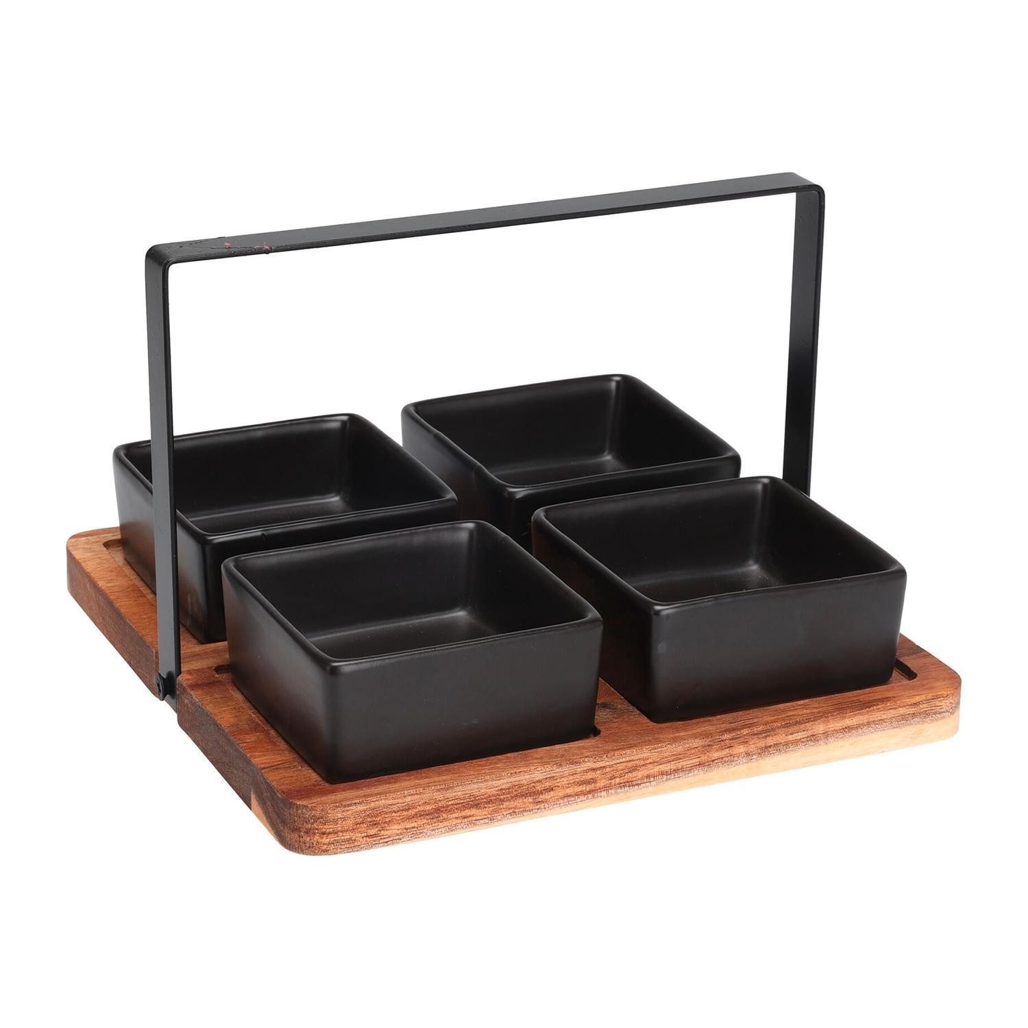 Lieferumfang | 5-teiliges Servier-Set: 1 Tablett mit Henkel und 4 Keramikschalen |