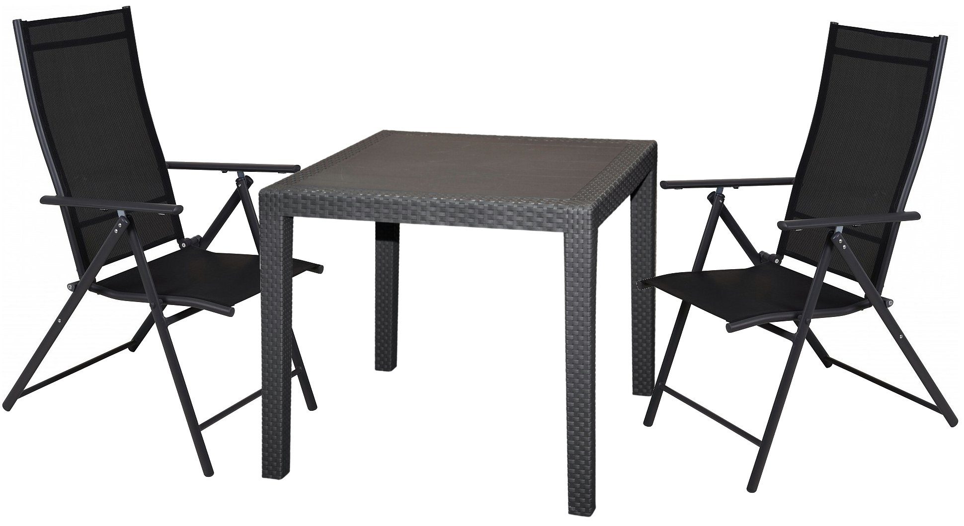 Garten Sitzmöbel Set bestehend aus 2 Hochlehner Stühlen und einem Gartentisch.