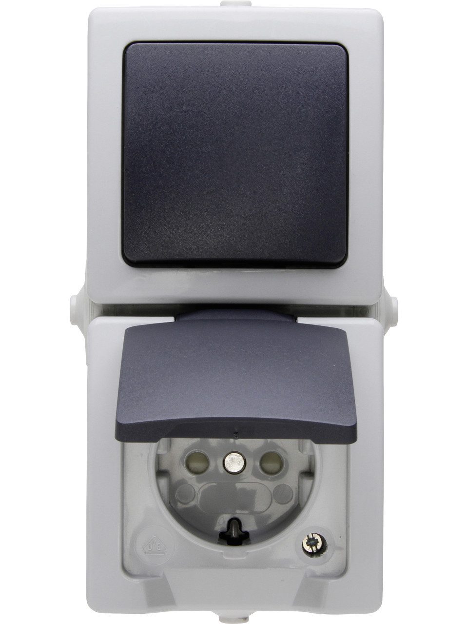 Aufputz-Feuchtraum Aus-/Wechselschalter-Steckdosenkombination im Design NAUTIC und der Farbe grau in senkrechter Ausführung. Steckdose mit Nennstrom von 16A. Aus-/Wechselschalter mit einem Schaltvermögen von 10AX. Schutzart IP44.