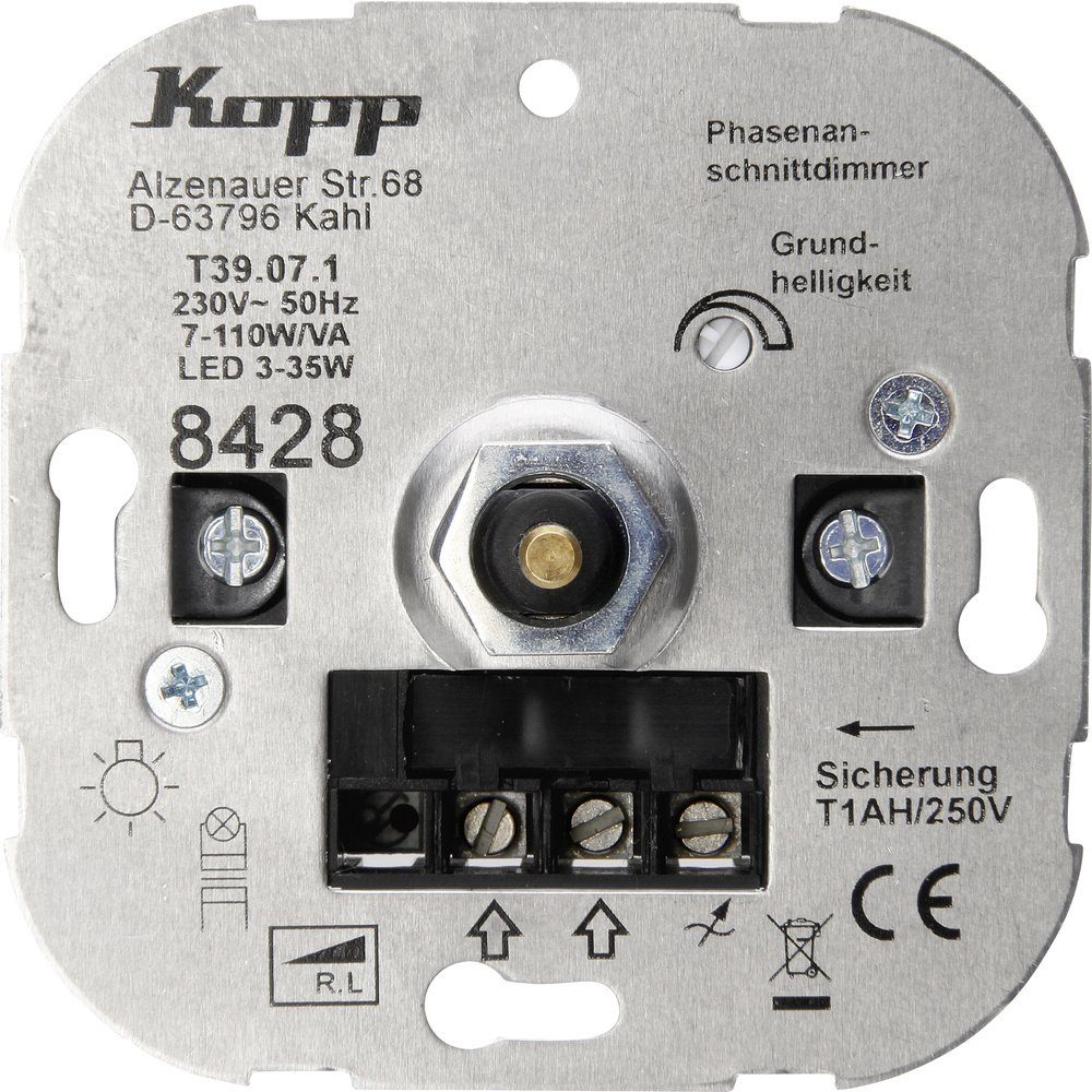 Druck-Wechselschalter - LED Dimmer, für Glüh und 230V Halogenlampen, dimmbare LED´s, sowie für Niedervolt-Halogenlampen mit konventionellen Trafos. Einstellbare Grundhelligkeit, mit Softrastung, Welle 4 mm, Phasenanschnitt RL 7-110W/VA