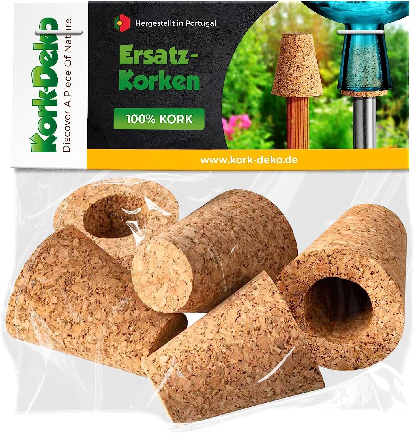 5er Pack Korkaufsätze für die Befestigung von Lauschaer Gartenkugeln, Rosenkugeln und weiteren Dekoelementen im Garten Hergestellt in Portugal bestehen die Korken aus widerstandsfähigem Presskork, der langlebig ist und auch über die Jahreszeiten hinweg einen sicheren Halt für Ihre Rosenkugeln gewährleistet. Die als Sacklock gefertigte Bohrung mit einem Durchmesser von 18 mm und einer Tiefe von 25 mm kann auf viele verschiedene Rosenkugelstäbe aufgesteckt werden. Die konische Form des Korkstopfens gewährleistet ein einfaches Aufstecken von Gartenkugeln in verschiedenen Größen. An der Oberseite weist der Korken einen Durchmesser von 20 mm, an der Unterseite von 35 mm auf. Kugeln aus Glas, Keramik und Porzellan können ohne Bedenken auf den Korken aufgesteckt werden. Mit einer Gesamtlänge von 40 mm können auch sehr große Kugeln mit langen Hals sicher befestigt werden. Die Korken sind passend für die bekannten Glas- und Rosenkugeln der Lauschaer Glaskunst, auch bekannt als Lauscha Glas. Kork ist ein Material mit einer guten Ökobilanz verglichen mit Aufsätzen aus Kunststoff oder Plastik. Die Eigenschaften des praktischen 5er Pack Korkstopfen für Rosenkugeln auf einen Blick: Lieferumfang 5 Verschlussstopfen aus Kork Gesamtlänge Korken: 40 mm Durchmesser Oberseite: 20 mm Durchmesser Unterseite: 35 mm Bohrungsdurchmesser: 18 mm Bohrungstiefe: 25 mm Witterungsbeständig und langlebig Passend für Lauschaer Glaskugeln