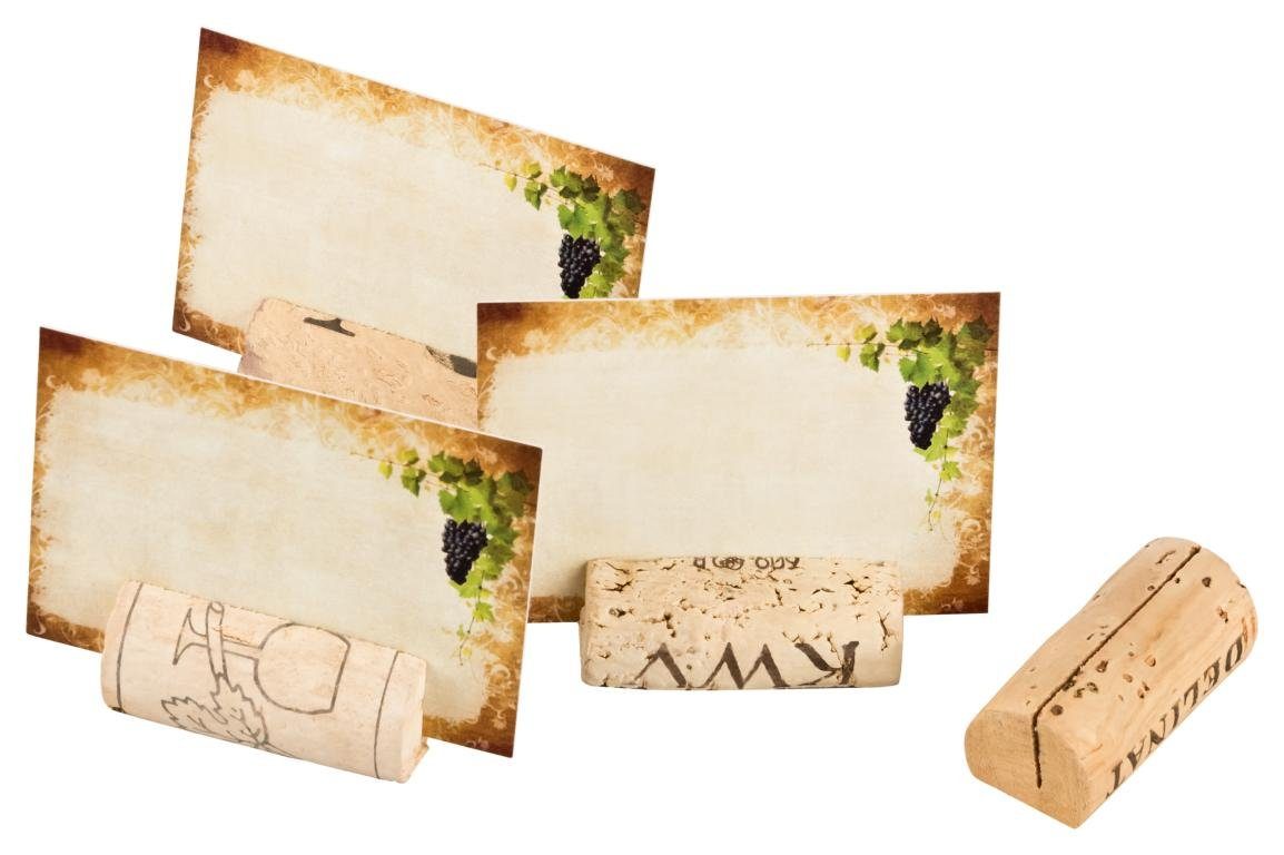Die bedruckten Tischkarten mit den Maßen 5,2 x 7,4 cm sind mit einem Weintrauben-Motiv im Vintage-Stil versehen, während die blanko Kärtchen weiß sind. Für die Kärtchenhalter wurden ausschließlich Weinkorken verwendet, die unterschiedlich in Optik und Размер sind. Die Korken wurden halb maschinell/halb von Hand verarbeitet und haben einen sauberen, geraden Schlitz mit leichter Neigung (ca. 15°). In diesen Schlitz kann die beschriftete Namenskarte gesteckt werden - es ist also weder Sägen noch Basteln dafür notwendig.