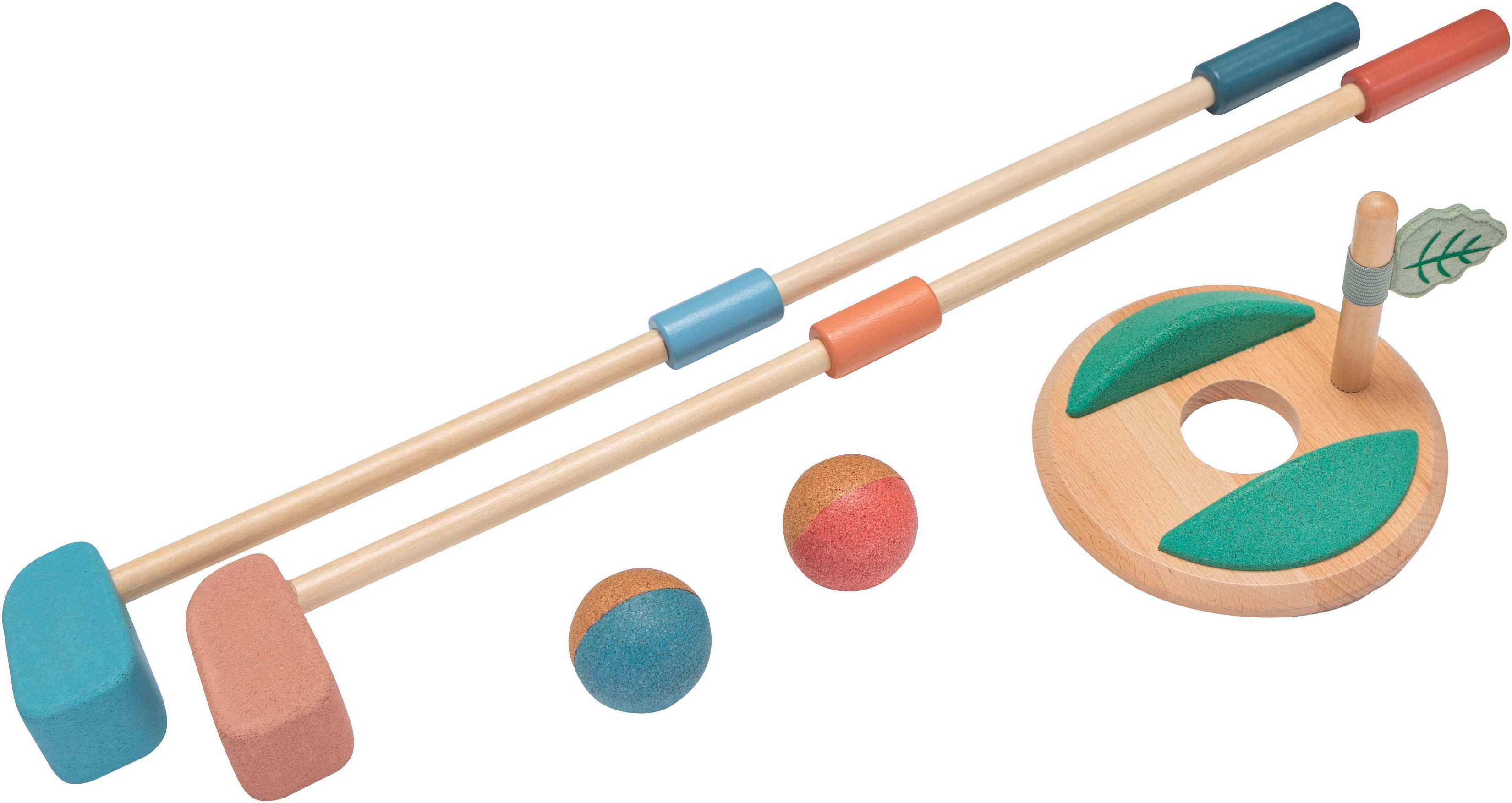 Dieses Minigolf-Set ist ein flexibles Werkzeug zur Förderung von Entwicklungsfähigkeiten und eignet sich für den Spaß drinnen und draußen. Es ist aus Materialien wie Kork, Holz und Filz gefertigt und bietet eine dynamische Lernplattform.
