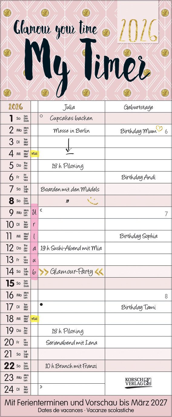 Bringen Sie etwas Glamour in Ihren Alltag! Zarte Pastelltöne und edles Schwarz treffen auf geometrische Trendmuster, Typoart und Grafiken im Goldglitter-Look. Setzen Sie Ihre Termine glamourös in Szene und profitieren Sie zugleich von der hohen Funktionalität eines modernen Terminplaners. Dieser Wandkalender hilft Ihnen dabei alle wichtigen Termine stets im Blick zu haben. Mit zwei Spalten zum Eintragen von Geburtstagen, Terminen und Erinnerungen bietet dieser Jahreskalender viel Platz für Notizen. Dadurch ist es auch möglich mehrere Termine in einen Tag zu schreiben. Er eignet sich perfekt für die Organisation des Single- oder Ehelebens. Neben dem gesamten Kalenderjahr enthält der Wandplaner auch eine Vorschau bis März des Folgejahres. Впередe Informationen wie Mondphasen, Ferientermine und Feiertage (auch regionale) sowie deutlich lesbare Kalenderwochen runden den Kalender ab und sorgen für einen vollständigen Überblick Ihres Jahres. Übersichtlicher Familienplaner für bis zu 2 Personen; sehr stabile Rückwand; 19 x 46 cm Terminkalender mit viel Platz für Eintragungen, ohne störende Bilder in den Spalten