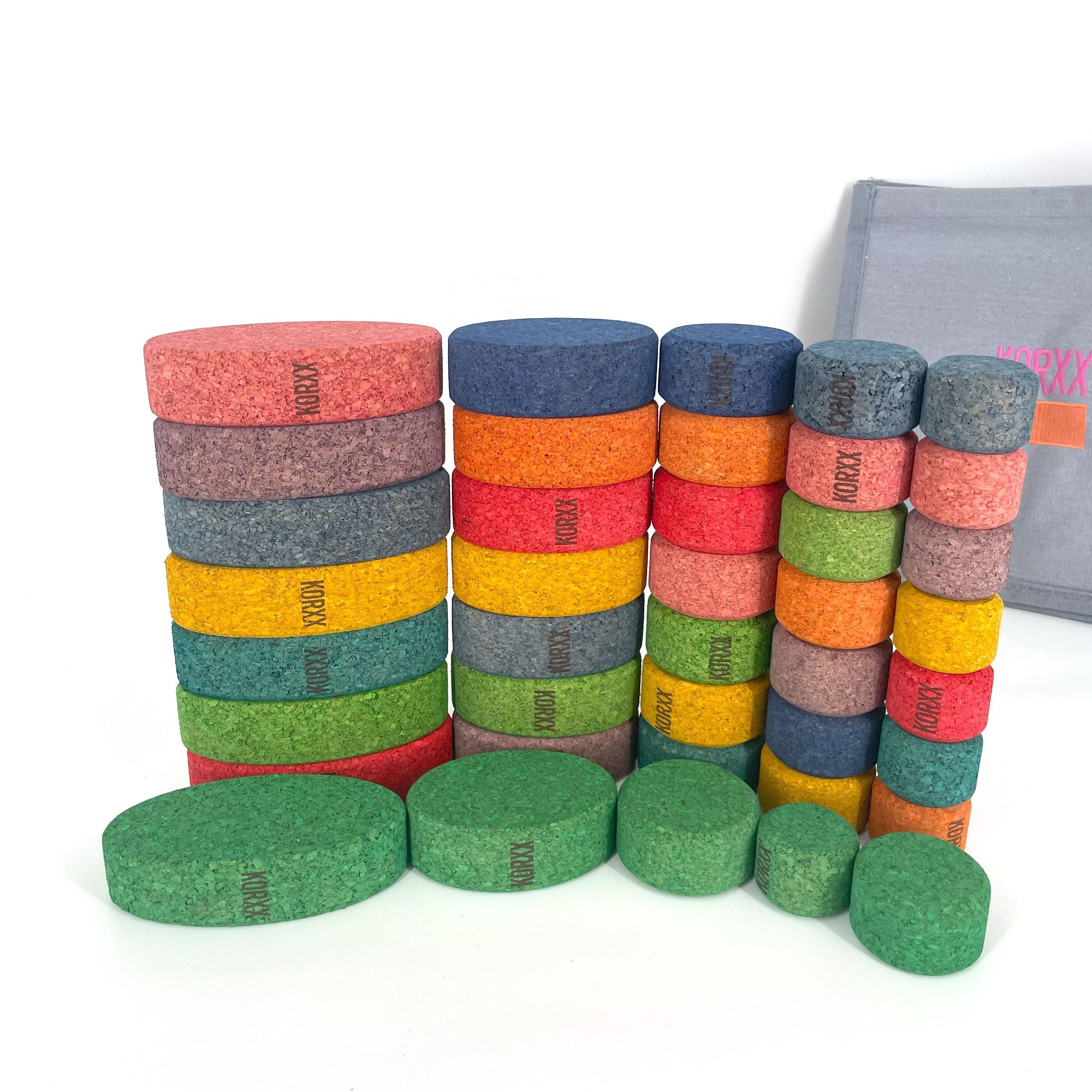 Mit dem Kuller Mix Color edu Baukasten von KORXX sind besonders spannende Kreationen möglich, da die runden und ovalen Korkbauklötze durch ihre Form zu statisch fast unmöglichen Konstruktionen aufeinander gebaut werden können. 40 bunte Bausteine.