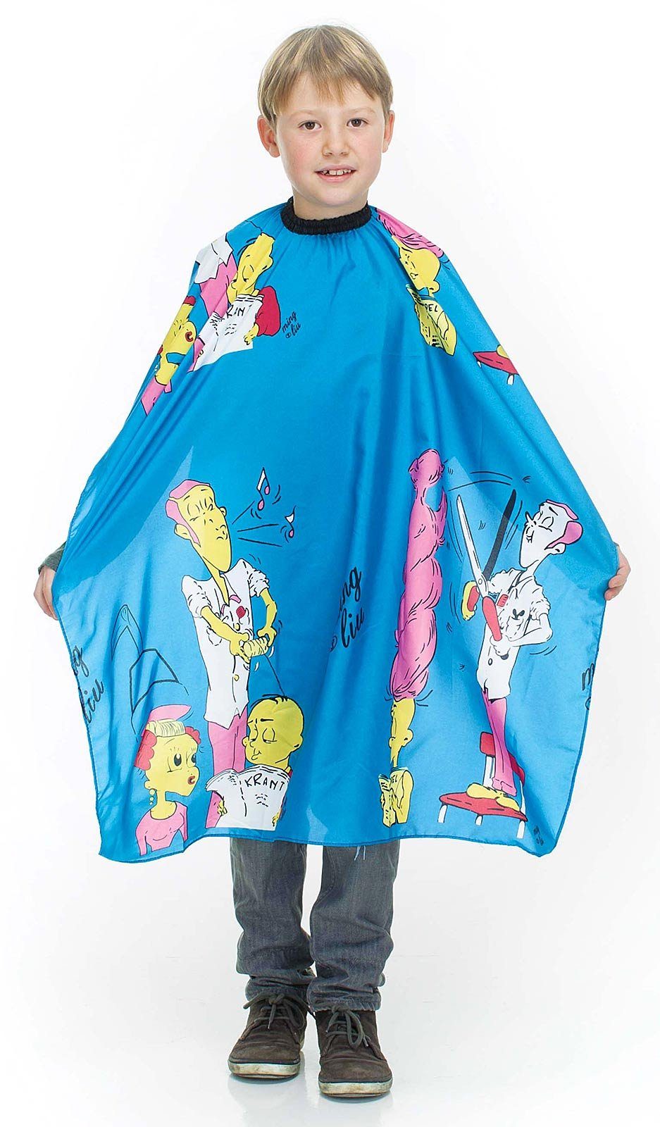 Friseurumhang für Kinder Blau mit Applikationen Haarschneideumhang Größe:83x125h 100% Polyester Perfekt zum Schneiden von Haaren.