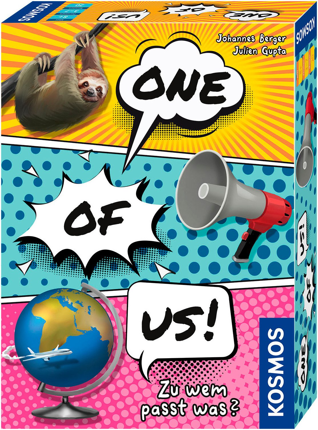 In One of Us wählen drei bis sieben Spielerinnen und Spieler ab 8 Jahren eine Person, mit der sie die aufgedeckte Karte am stärksten verbinden. Wenn die Mehrheit sich einig ist, gibt es einen Punkt für die Gruppe. Dieses kooperative Partyspiel ist in einer praktischen Box für unterwegs erhältlich, sodass man es überallhin mitnehmen kann. Für lustige Gespräche und unvergessliche Momente! Welche Mitspielerin oder welcher Mitspieler wird von allen anderen sofort mit dem aufgedeckten Motiv auf der Karte assoziiert, wie zum Beispiel einer Katze, einem Handy oder einem Zauberer? In dem Spiel One of Us wählen drei bis sieben Spielerinnen und Spieler ab 8 Jahren eine Person aus, mit der sie das aufgedeckte Motiv am stärksten verbinden. Wenn die Mehrheit sich einig ist, erhält die Gruppe einen Punkt. Dieses kooperative Partyspiel ist in einer praktischen Box erhältlich, die man überallhin mitnehmen kann. Eine kurze Einführung ermöglicht es, sofort in lustige Gespräche und Spielrunden einzutauchen und gemeinsam unvergessliche Momente zu erleben!