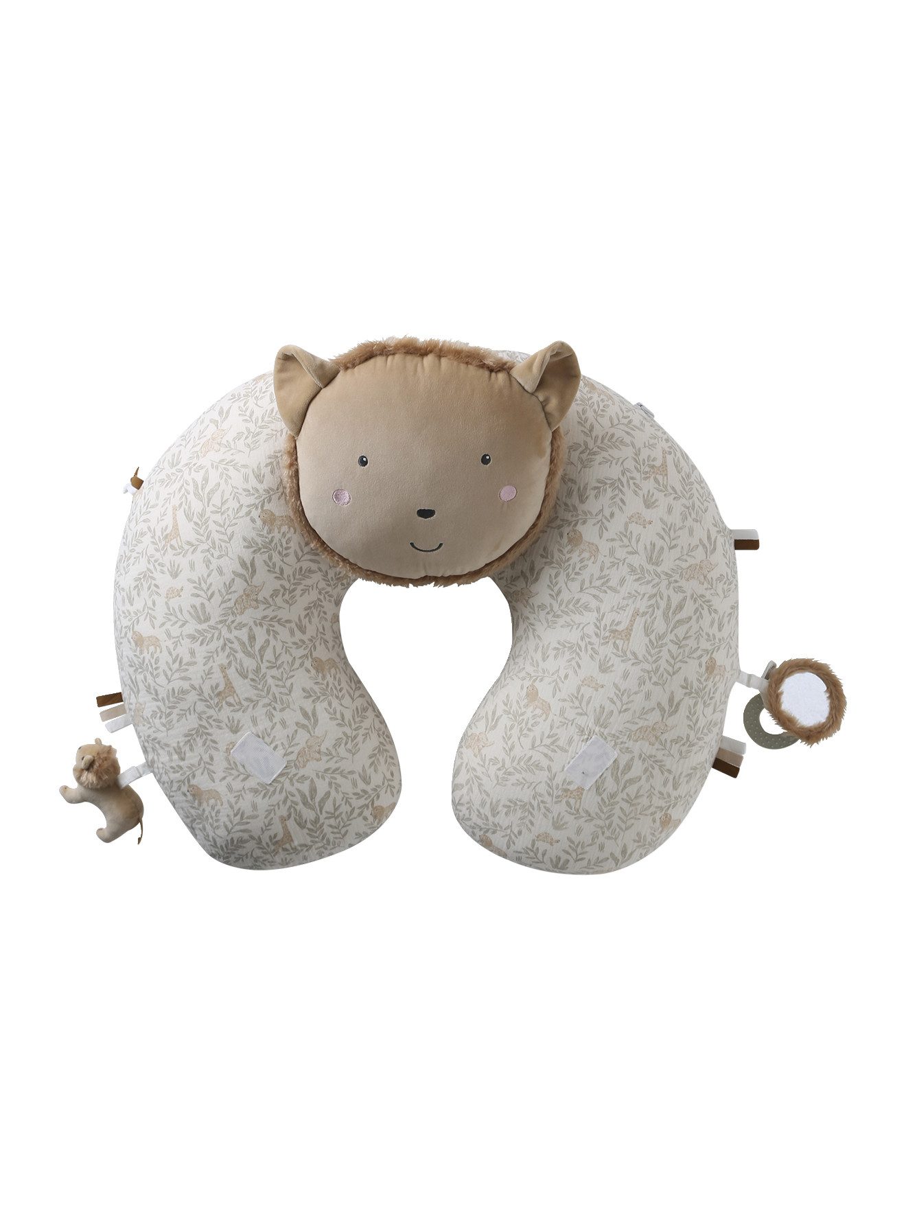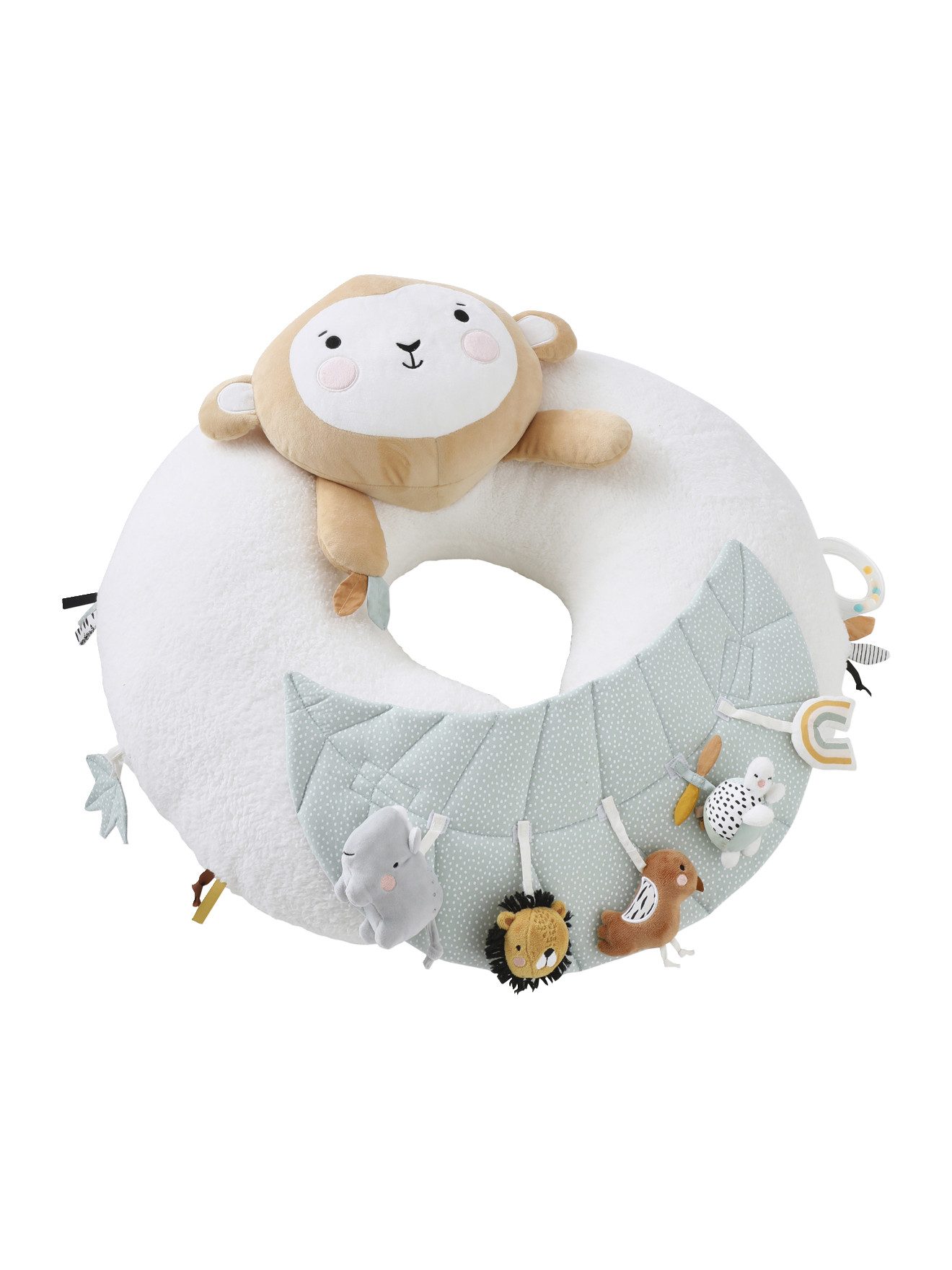 3D-Tierköpfe auf dem runden Kissen Flaches Kissen: Befestigung mit Klett. Verschiedene Spielelemente, einige sind abnehmbar. Rundum angebrachte Klettriegel zum Befestigen weiterer Spielzeuge