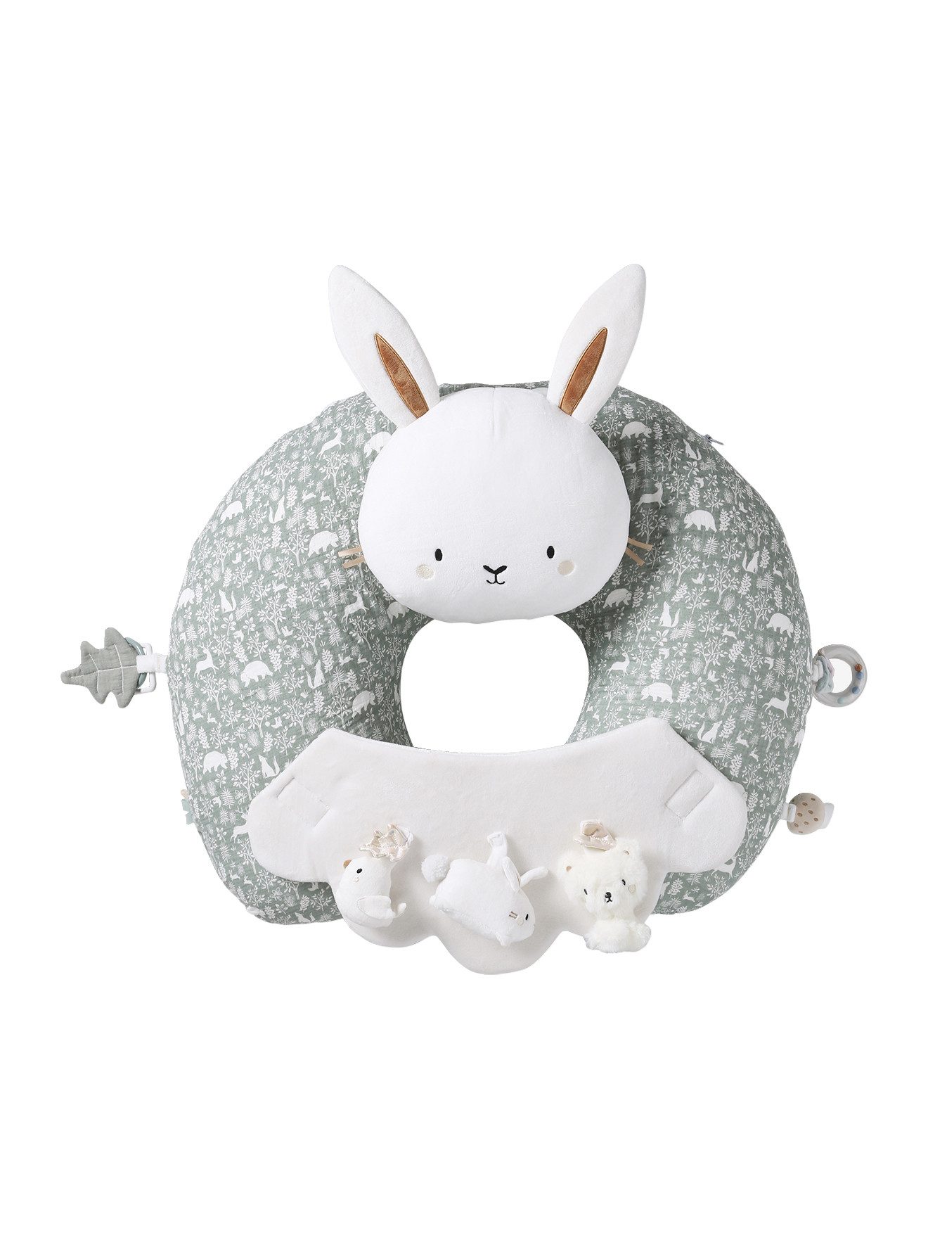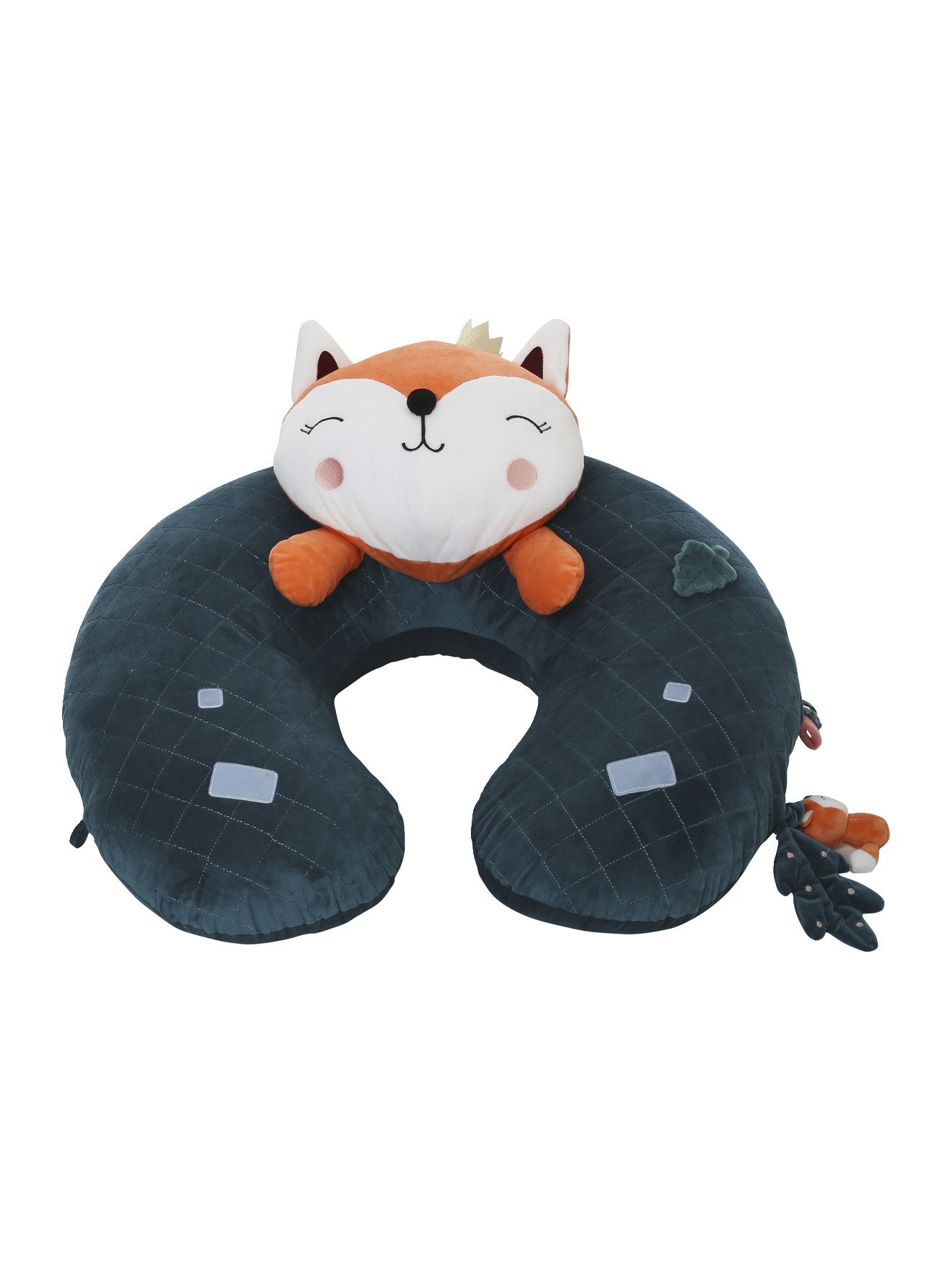 Märchenwald: Samt-Kissen gesteppt mit 3D-Fuchskopf mit goldener Krone Abnehmbare Spielzeuge: Hirsch mit Glöckchen im Inneren, Hase, Rassel-Beißring mit 2 Blättern: 1 aus Baumwolle und 1 aus Samt Spielzeuge nicht abnehmbar: 1 Pilz + 1 Fuchs mit Blatt, Bänder