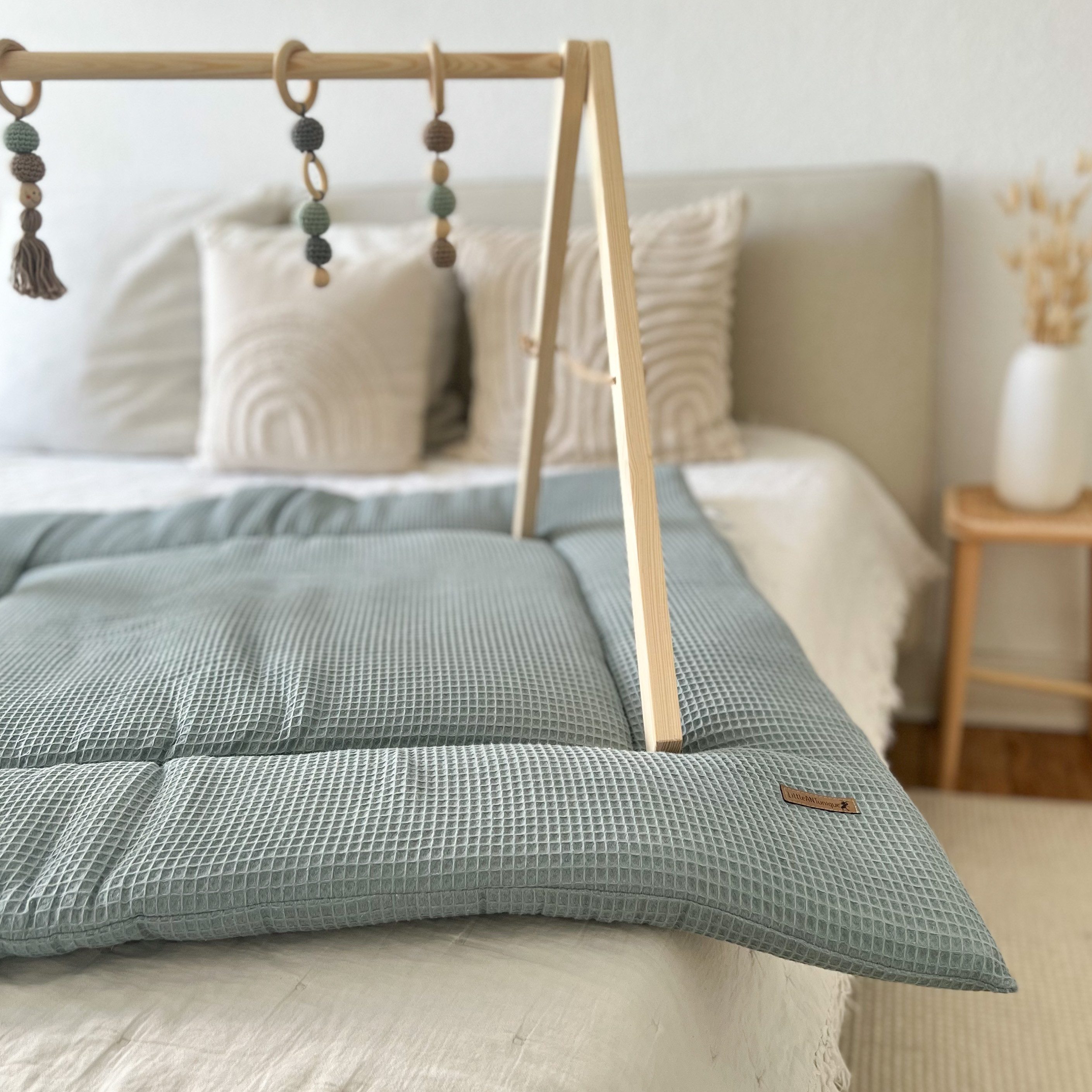 Unsere in der hauseigenen Hamburger Näherei gefertigte Krabbeldecke bietet mit ihrer 4–5 cm dicken Vlieseinlage eine besonders weiche und sichere Unterlage für Ihr Baby. Wir verwenden ausschließlich qualitativ hochwertige Materialien. Die Decke kann als Spielunterlage, Krabbeldecke oder Polsterung für das Laufgitter verwendet werden.