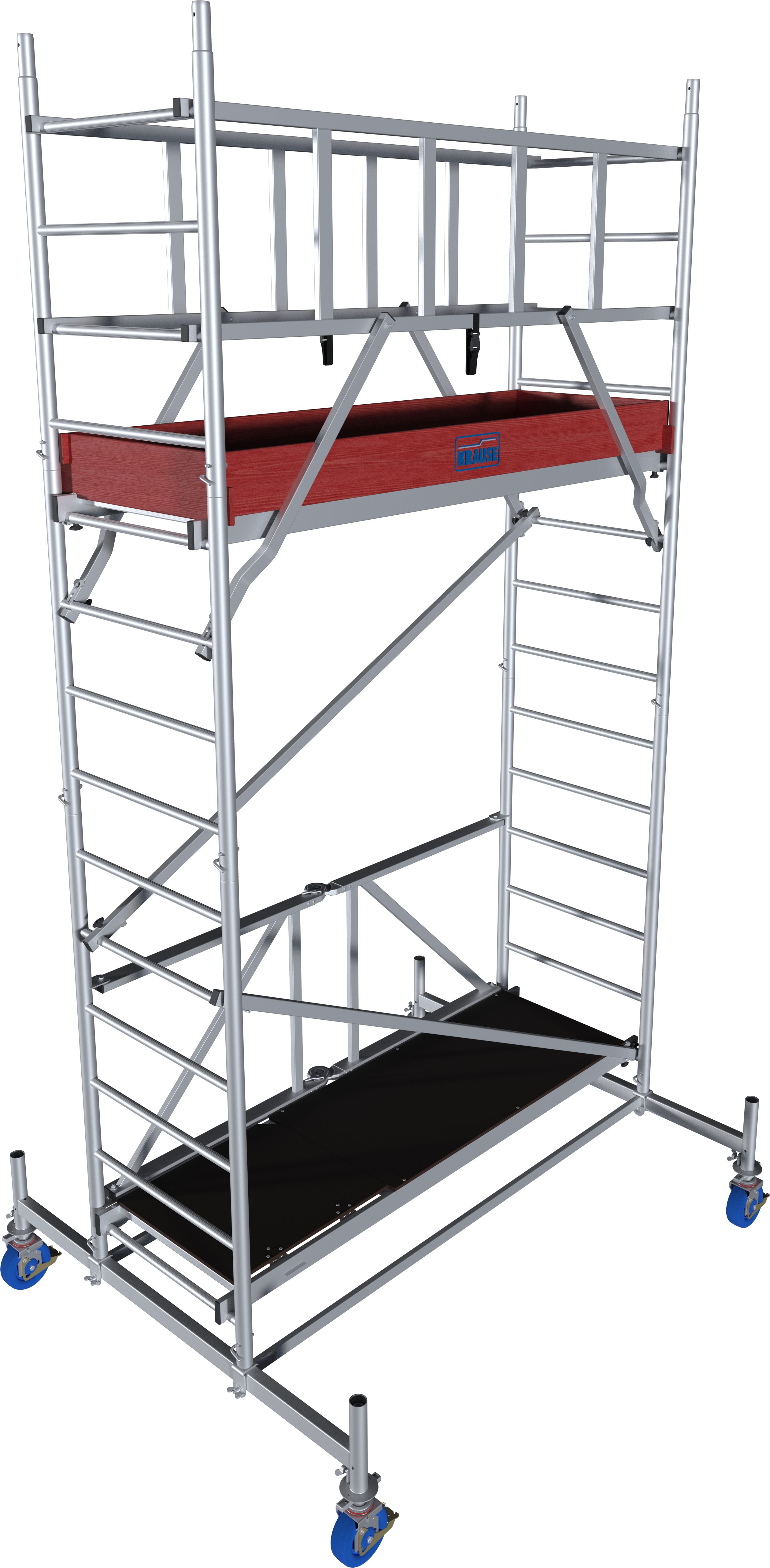 Das schnell aufzubauende und leicht zu transportierende Alu-Falt- Gerüst mit gebremsten Fahrrollen für Innen- und Außenarbeiten. Belastbarkeit 200 kg/m² nach DIN EN 1004-1. Grundeinheit faltbar für schnelleren Aufbau. Die Grundeinheit passt mit 1,80 m Höhe aufgebaut durch Türrahmen und ist aufstockbar bis zu einer Arbeitshöhe von 11,80 m. Durch die Befestigung des Geländerrahmens GuardMatic-System vor dem Einhängen der nächsthöheren Belagbühne ist der sichere Aufbau gewährleistet. Beim Durchsteigen der Belagbühne ist ein komplettes Geländer und damit eine Absturzsicherung vorhanden. Die Integration der Diagonalen in das GuardMatic-System gewährleistet eine einfache und sichere Montage. Für Transport oder Lagerung kann der Geländerrahmen platzsparend zusammengefaltet werden. Die 6-Punkt-Fixierung des GuardMatic-Systems sorgt für maximale Stabilität in der Höhe. Kraftschlüssige halbautomatische Diagonalen-Verbindungen ermöglichen den einfachen, schnellen und sicheren Aufbau. Die innovative Form der Diagonalen bietet eine maximale Nutzfläche auf der Belagbühne und stört in keiner Weise. Maximaler Belagbühnenabstand von 2 m für komfortablen und sicheren Aufbau ohne Hilfsmittel. Sicherer Innenaufstieg durch rutschhemmende profilierte Sprossen. Zwei im Lieferumfang enthaltene 1-Meter Vertikalrahmen, die zu einem 2-Meter Vertikalrahmen zusammengesteckt werden können, ermöglichen flexiblen Aufbau. Wetterfeste und rutschhemmende Belagbühnen (2,00 x 0,60 m). Gebremste Fahrrollen zum Ausgleich von Bodenunebenheiten (ab Arbeitshöhe 3,80 m höhenverstellbar). Leicht zu montierende Ausleger sorgen ab einer Arbeitshöhe von 6,80 m für zusätzliche Standsicherheit. Optimale Standsicherheit durch hochfeste Stahl-Traverse ab einer Arbeitshöhe von 3,80 m.