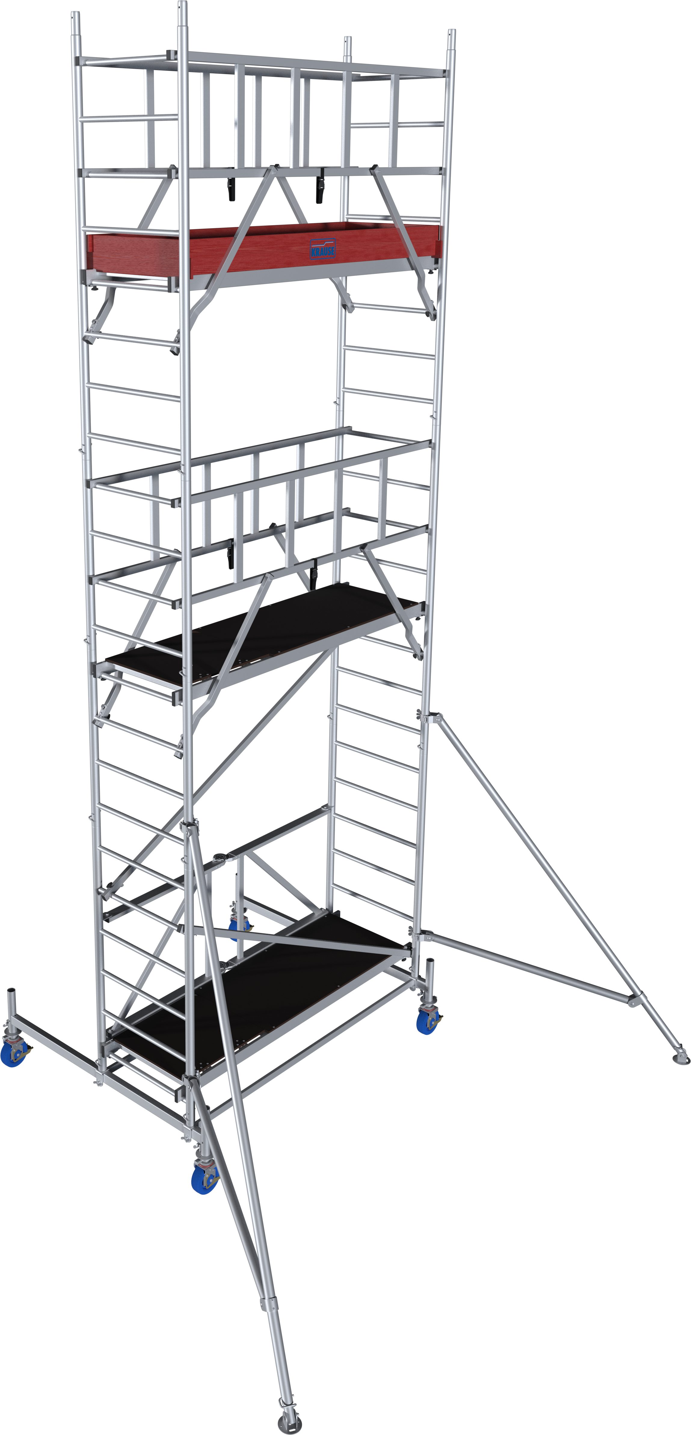 Das schnell aufzubauende und leicht zu transportierende Alu-Falt- Gerüst mit gebremsten Fahrrollen für Innen- und Außenarbeiten. Belastbarkeit 200 kg/m² nach DIN EN 1004-1. Grundeinheit faltbar für schnelleren Aufbau. Die Grundeinheit passt mit 1,80 m Höhe aufgebaut durch Türrahmen und ist aufstockbar bis zu einer Arbeitshöhe von 11,80 m. Durch die Befestigung des Geländerrahmens GuardMatic-System vor dem Einhängen der nächsthöheren Belagbühne ist der sichere Aufbau gewährleistet. Beim Durchsteigen der Belagbühne ist ein komplettes Geländer und damit eine Absturzsicherung vorhanden. Die Integration der Diagonalen in das GuardMatic-System gewährleistet eine einfache und sichere Montage. Für Transport oder Lagerung kann der Geländerrahmen platzsparend zusammengefaltet werden. Die 6-Punkt-Fixierung des GuardMatic-Systems sorgt für maximale Stabilität in der Höhe. Kraftschlüssige halbautomatische Diagonalen-Verbindungen ermöglichen den einfachen, schnellen und sicheren Aufbau. Die innovative Form der Diagonalen bietet eine maximale Nutzfläche auf der Belagbühne und stört in keiner Weise. Maximaler Belagbühnenabstand von 2 m für komfortablen und sicheren Aufbau ohne Hilfsmittel. Sicherer Innenaufstieg durch rutschhemmende profilierte Sprossen. Zwei im Lieferumfang enthaltene 1-Meter Vertikalrahmen, die zu einem 2-Meter Vertikalrahmen zusammengesteckt werden können, ermöglichen flexiblen Aufbau. Wetterfeste und rutschhemmende Belagbühnen (2,00 x 0,60 m). Gebremste Fahrrollen zum Ausgleich von Bodenunebenheiten (ab Arbeitshöhe 3,80 m höhenverstellbar). Leicht zu montierende Ausleger sorgen ab einer Arbeitshöhe von 6,80 m für zusätzliche Standsicherheit. Optimale Standsicherheit durch hochfeste Stahl-Traverse ab einer Arbeitshöhe von 3,80 m.