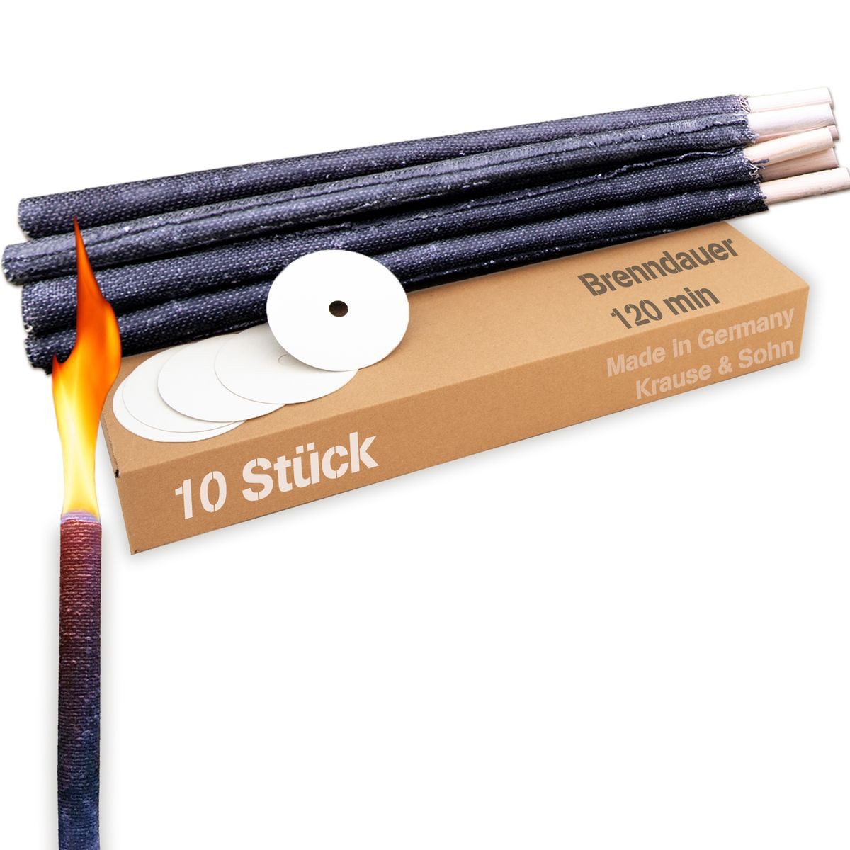 In diesem Paket erhalten 10 120 Minuten Fackeln, d.h. diese Wachsfackeln können jeweils bis zu 120 Minuten lang brennen. Die Fackeln können Sie zum Beispiel für lange Fackelwanderungen oder Umzüge verwenden. Ebenfalls können die großen Wachs Fackeln als Dekoration verwendet werden, indem Sie die Fackel am Griff in den Bode oder in einen Topf stecken. Beachten Sie bitte, dass die angegebene Brenndauer bei Windstille gilt und wenn die Fackel gerade gehalten oder gesteckt wird. Halten Sie die Fackel beispielsweise schräg oder weht starker Wind, dann verkürzt sich die Brenndauer.