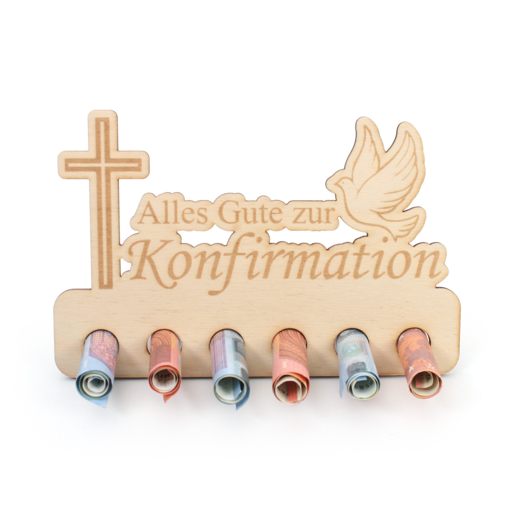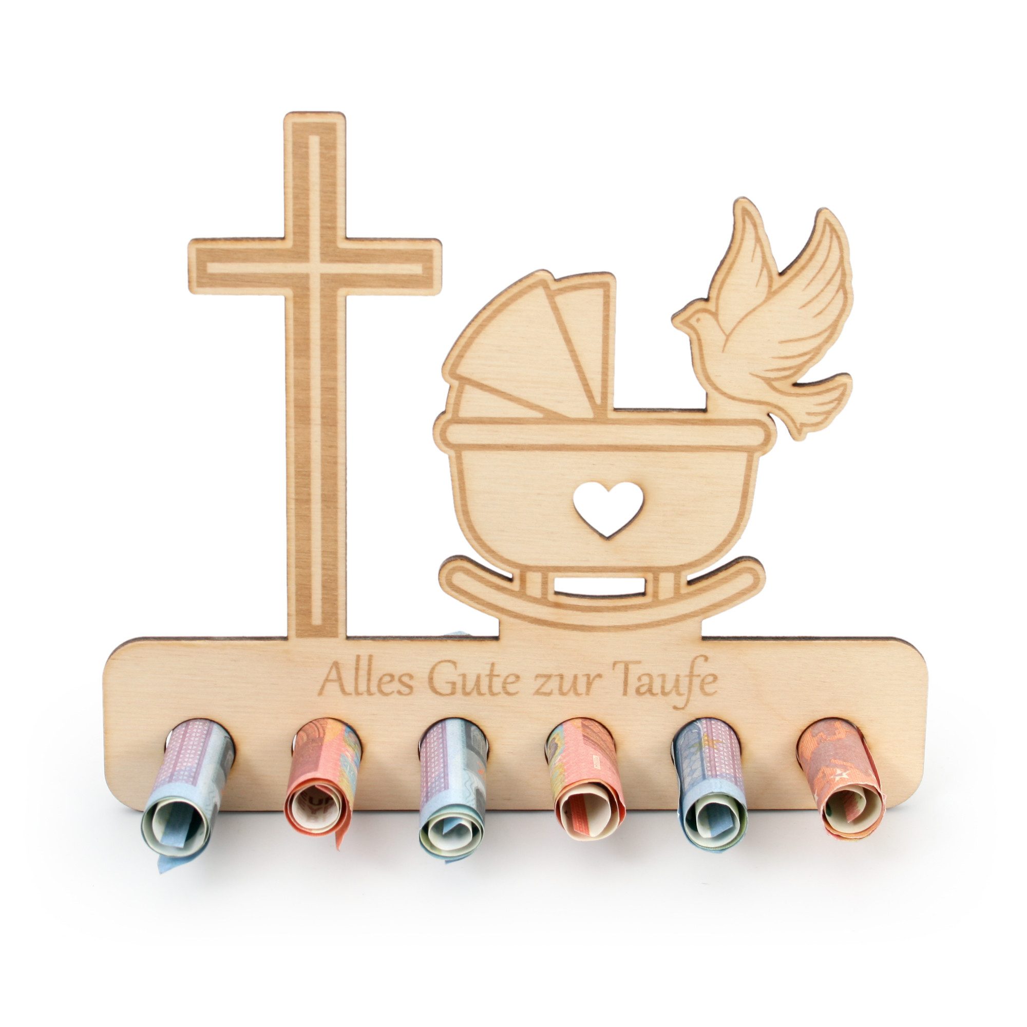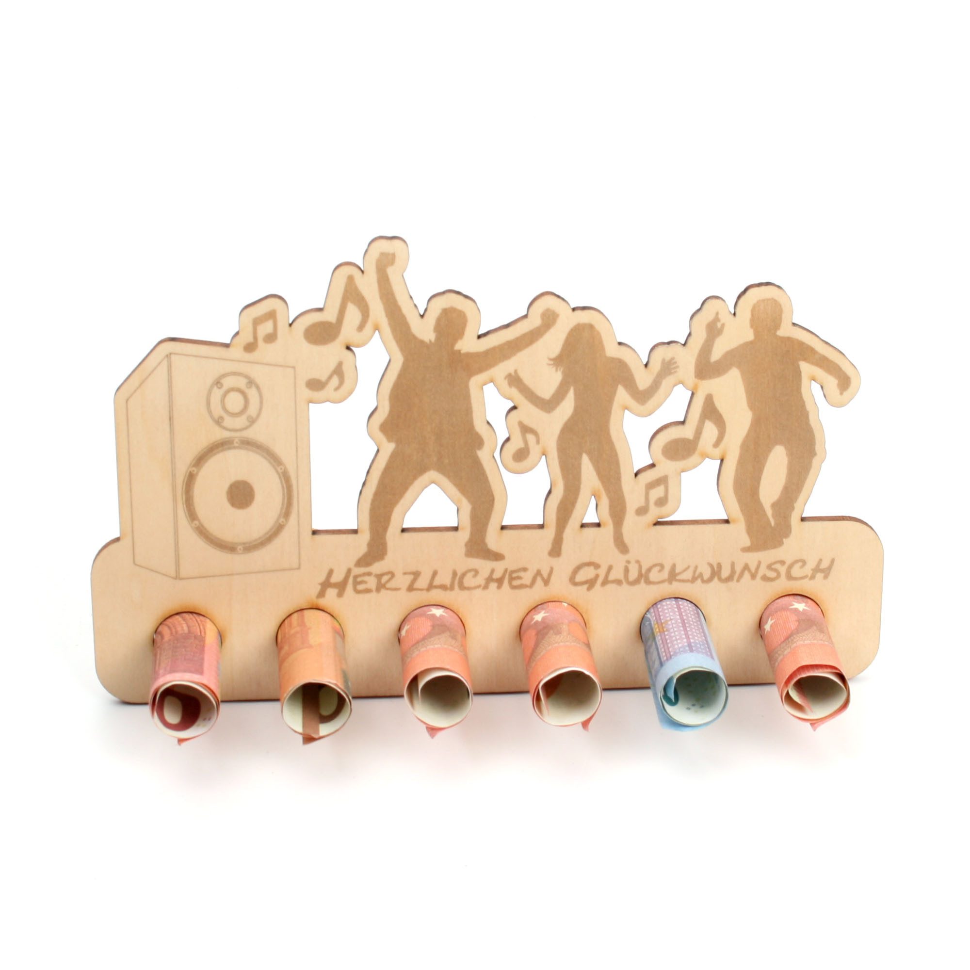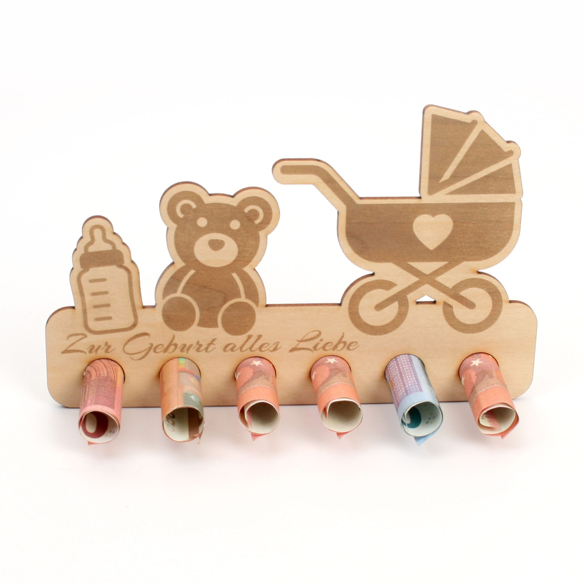 Geldscheine einfach einrollen und in die vorgesehenen Löcher stecken. Vorder - und Rückseite können ganz nach Belieben noch beschrieben oder dekoriert werden.
