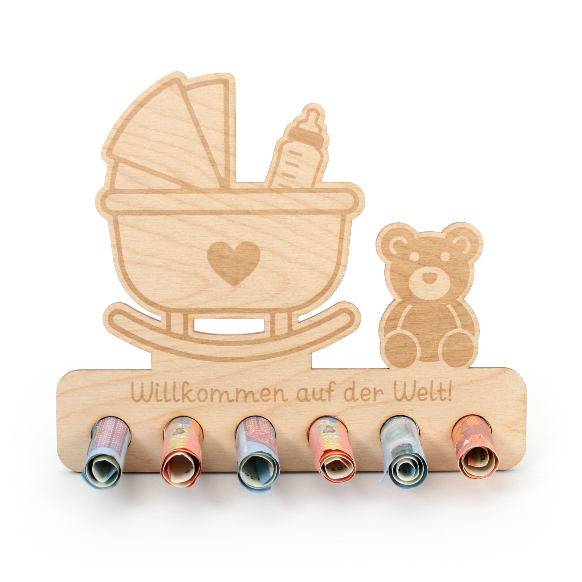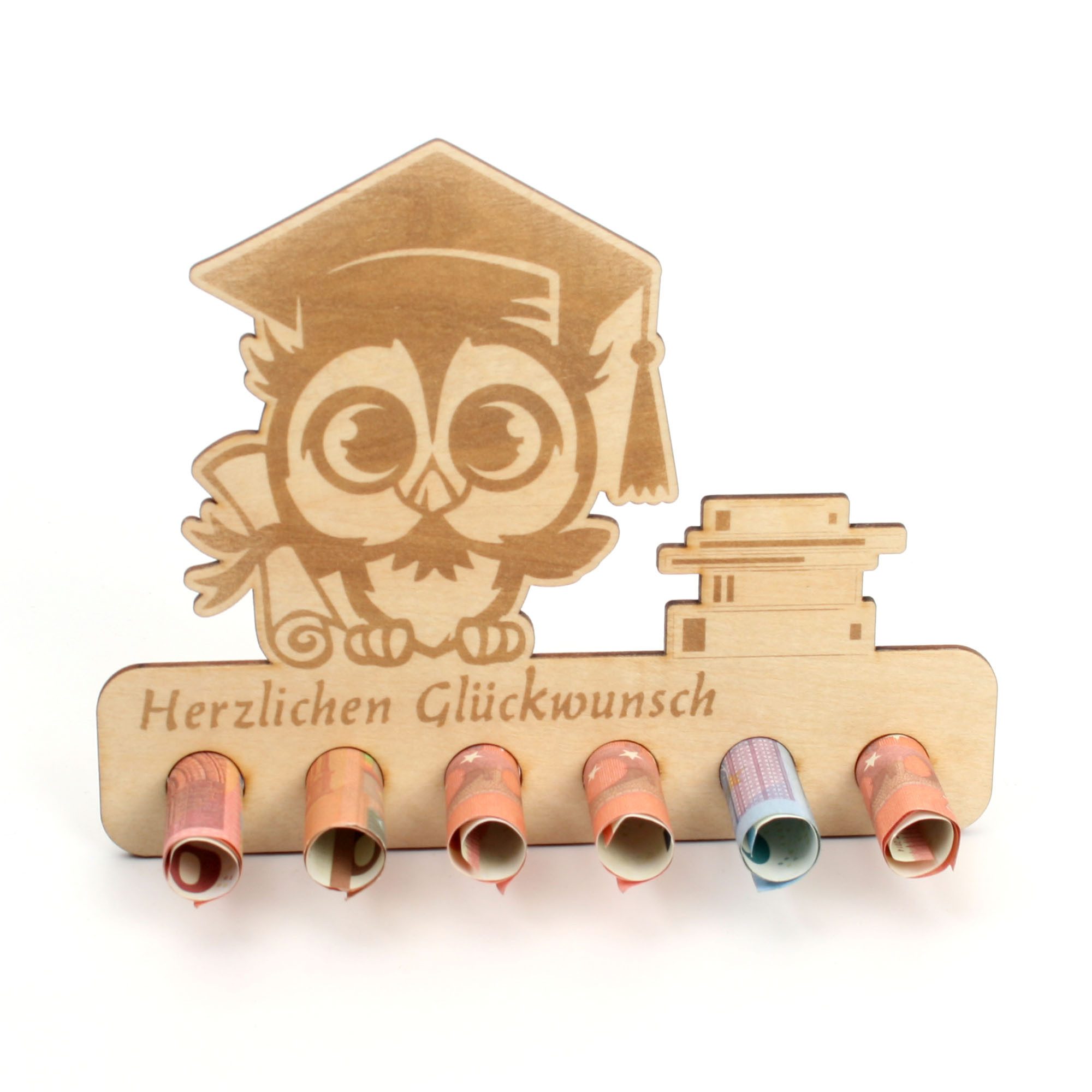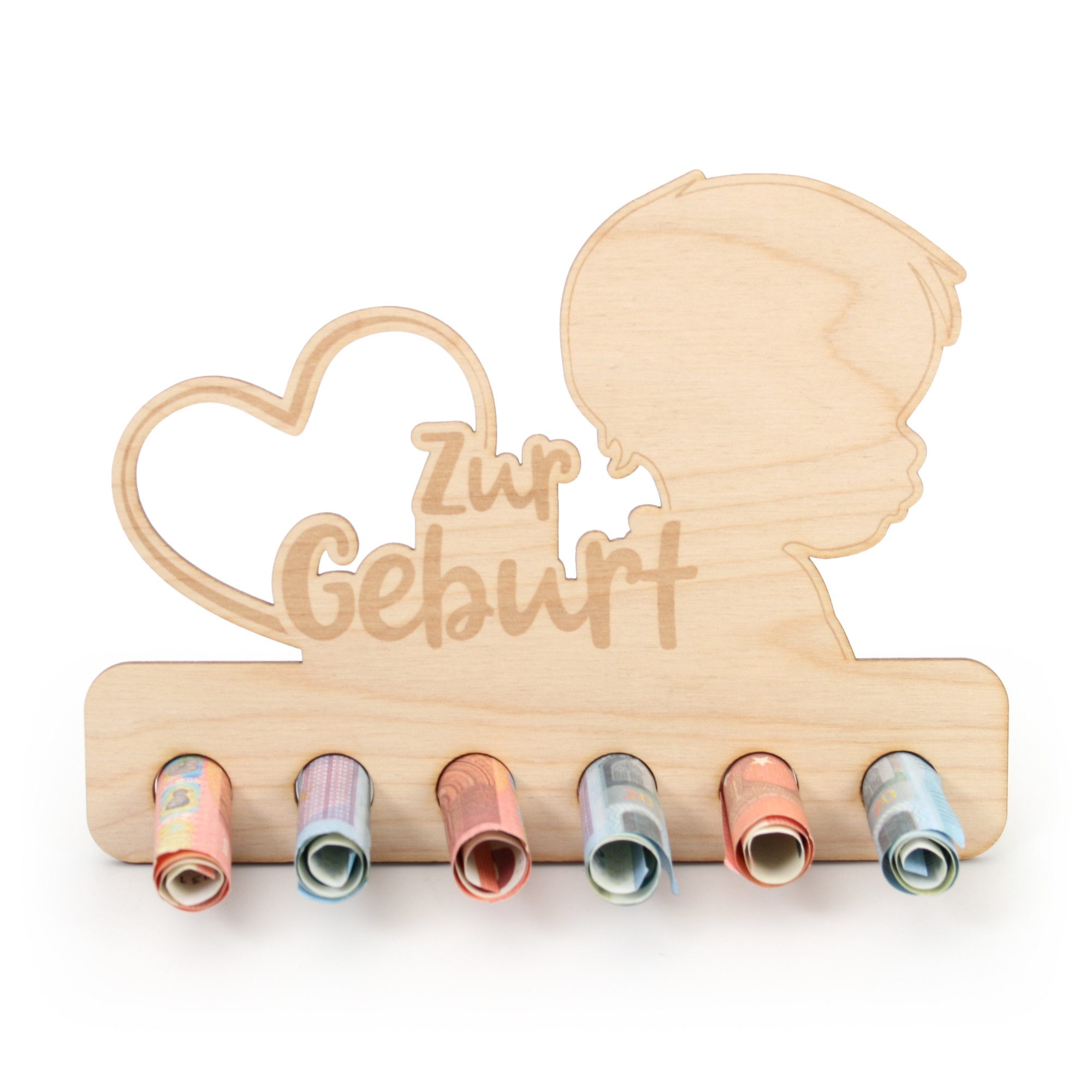 Geldscheine einfach einrollen und in die vorgesehenen Löcher stecken. Vorder - und Rückseite können ganz nach Belieben noch beschrieben oder dekoriert werden.