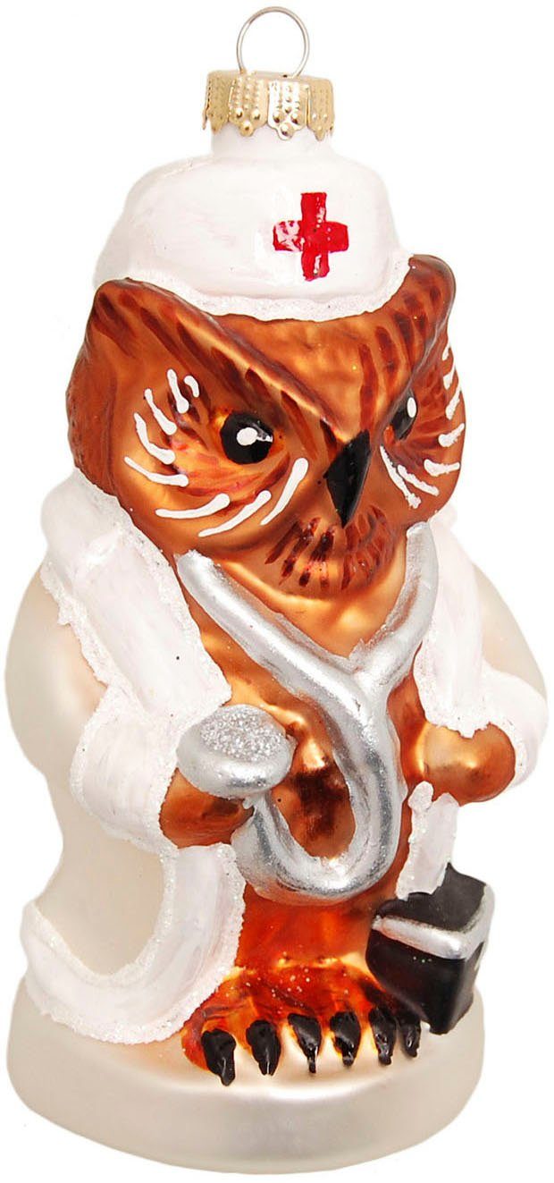 Das Glasornament Eule "Krankenschwester" ist ein einzigartiges und witziges Weihnachtsbaumschmuckstück, das an jedem Tannenbaum ein Blickfang sein wird. Es besteht aus mundgeblasenem Glas und hat eine Размер von 11 cm. Die braune Eule trägt einen weißen Kittel und ein Stethoskop, was sie zu einer perfekten Darstellung einer Krankenschwester macht. Dieses Glasornament ist nicht nur ein tolles Geschenk für Krankenschwestern und medizinische Fachkräfte, sondern auch für jeden, der sich für die Arbeit im Gesundheitswesen interessiert. Es ist einzigartig und wird sicherlich ein Lächeln auf das Gesicht jedes Betrachters zaubern. Das Glasornament Eule "Krankenschwester" ist ein hochwertiges Produkt, das sorgfältig hergestellt wurde und eine lange Lebensdauer hat. Es ist ein schönes Erinnerungsstück und kann jedes Jahr aufs Neue an dem Weihnachtsbaum aufgehängt werden.