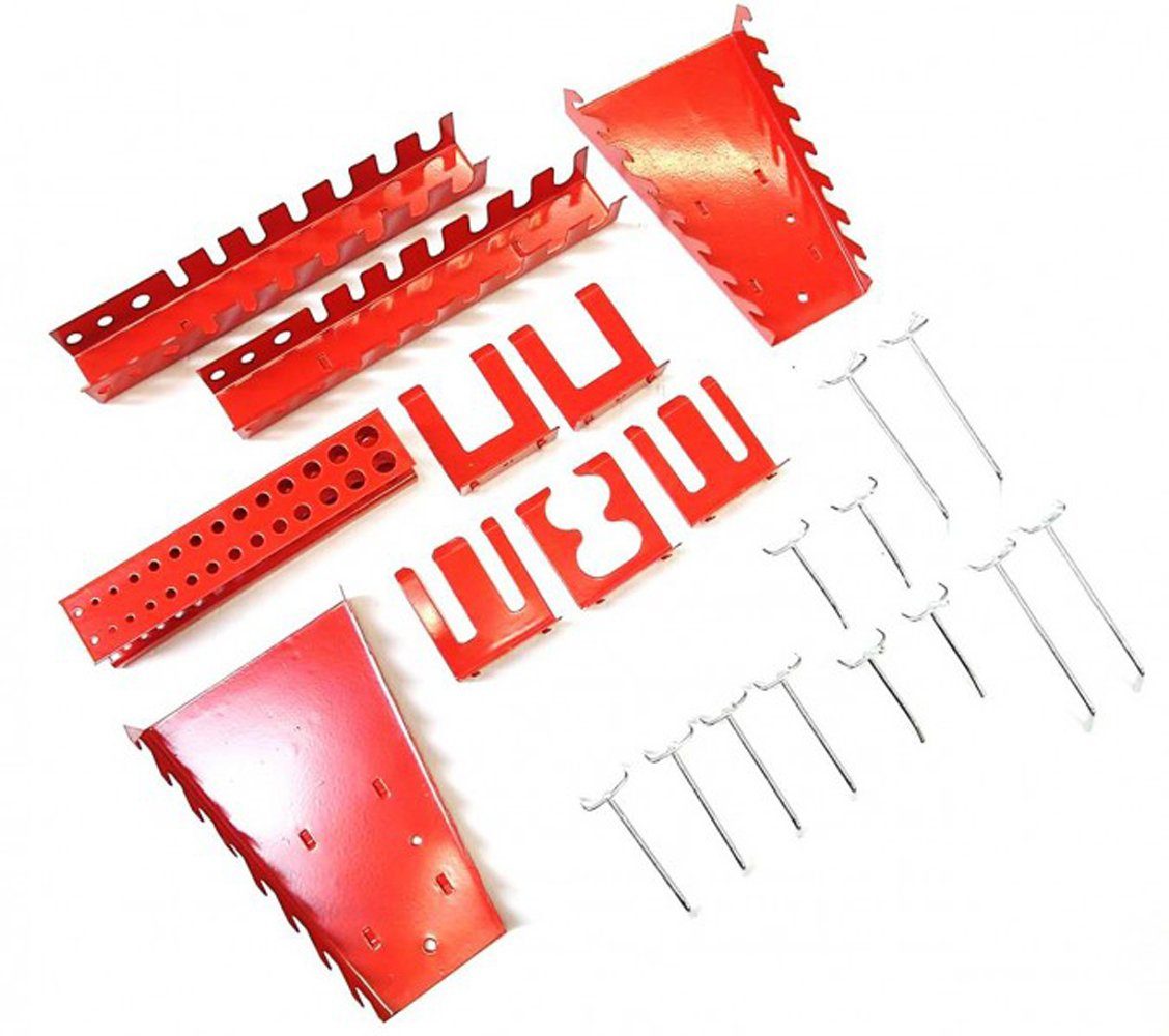 INFO - Haken: 5 x 12, 5 x 8 cm | Halter: 1 x 8 Ringschlüssel, 2 x 10 Schraubendreher, 1 x Kneifzangenhalter, 1 x Hammerhalter, 6 x multif. Halter | Halterungen für 28 Bohrer