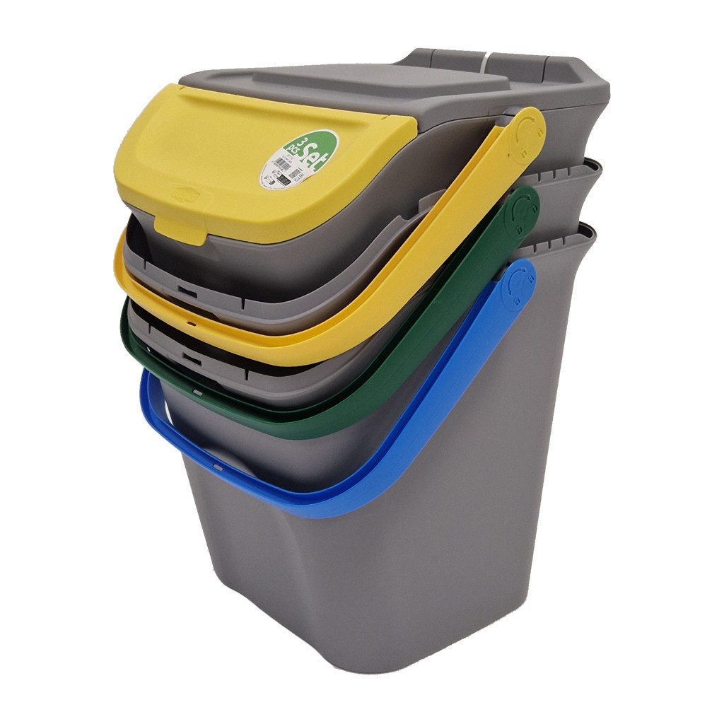 Das 3er-Set stapelbarer Mülleimer in Grau mit Deckeln in den Farben Blau, Grün und Gelb bietet eine praktische und optisch ansprechende Lösung für die Mülltrennung
