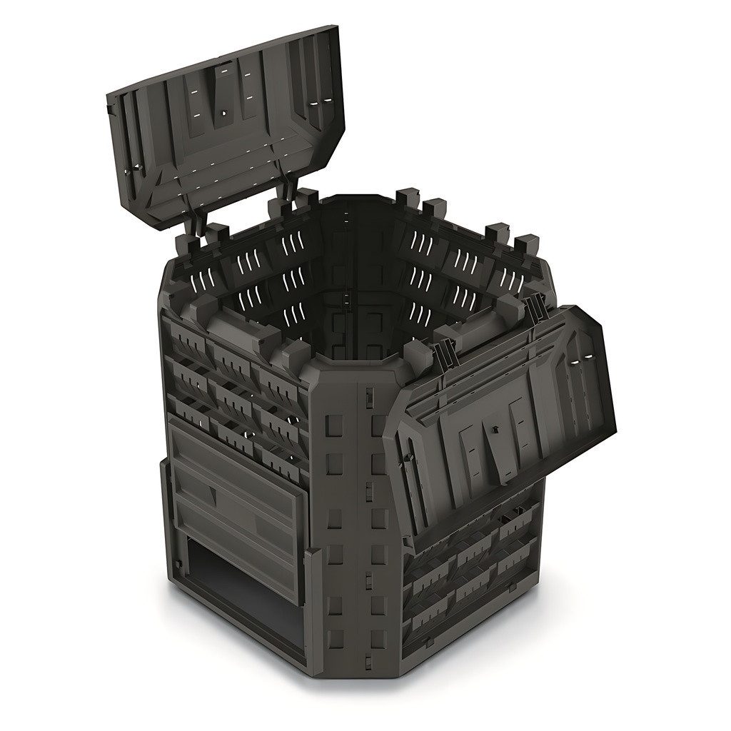 ALLE INFO'S - Gartenkomposter 310 Liter | Maße (BxTxH): 72 x 71,5 x 76,6 cm | Aus Kunststoff | Mit Deckel und zwei Schiebern | Mit 4 Bodenpfählen | Robust und Witterungsbeständig