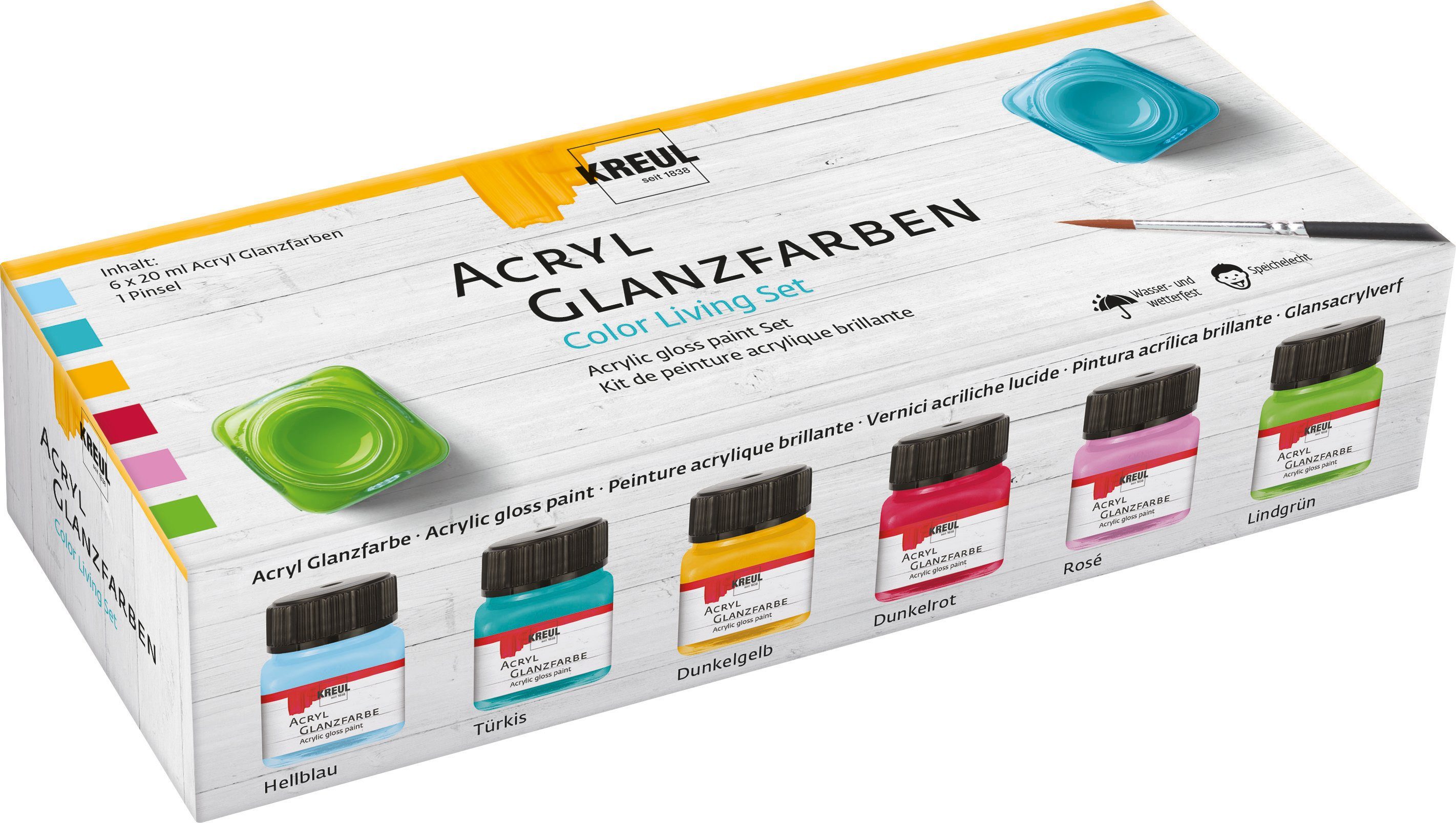 Mit dem KREUL Acryl Glanzfarben-Set 'Color Living' bringen Sie Gute-Laune-Farbtöne und Schwung in Ihre Kreativ-Ideen. Das Set besteht aus 6 Farben à 20 ml in den Farbtönen: Hellblau, Türkis, Dunkelgelb, Dunkelrot, Rosé und Lindgrün. Zum gleich Losmalen ist ein passender Pinsel mit im Set. Die Farben sind Made in Germany und finden auf vielfältigen Untergründen guten Halt. Gestalten Sie Windlichter, Holzdekorationen oder auch Möbel mit diesem Mix aus kühlen und warmen Nuancen und bringen so Farbe in den Alltag. Geeignet für die verschiedensten Maltechniken. Nach dem Trocknen sind die Farben überlackierbar.