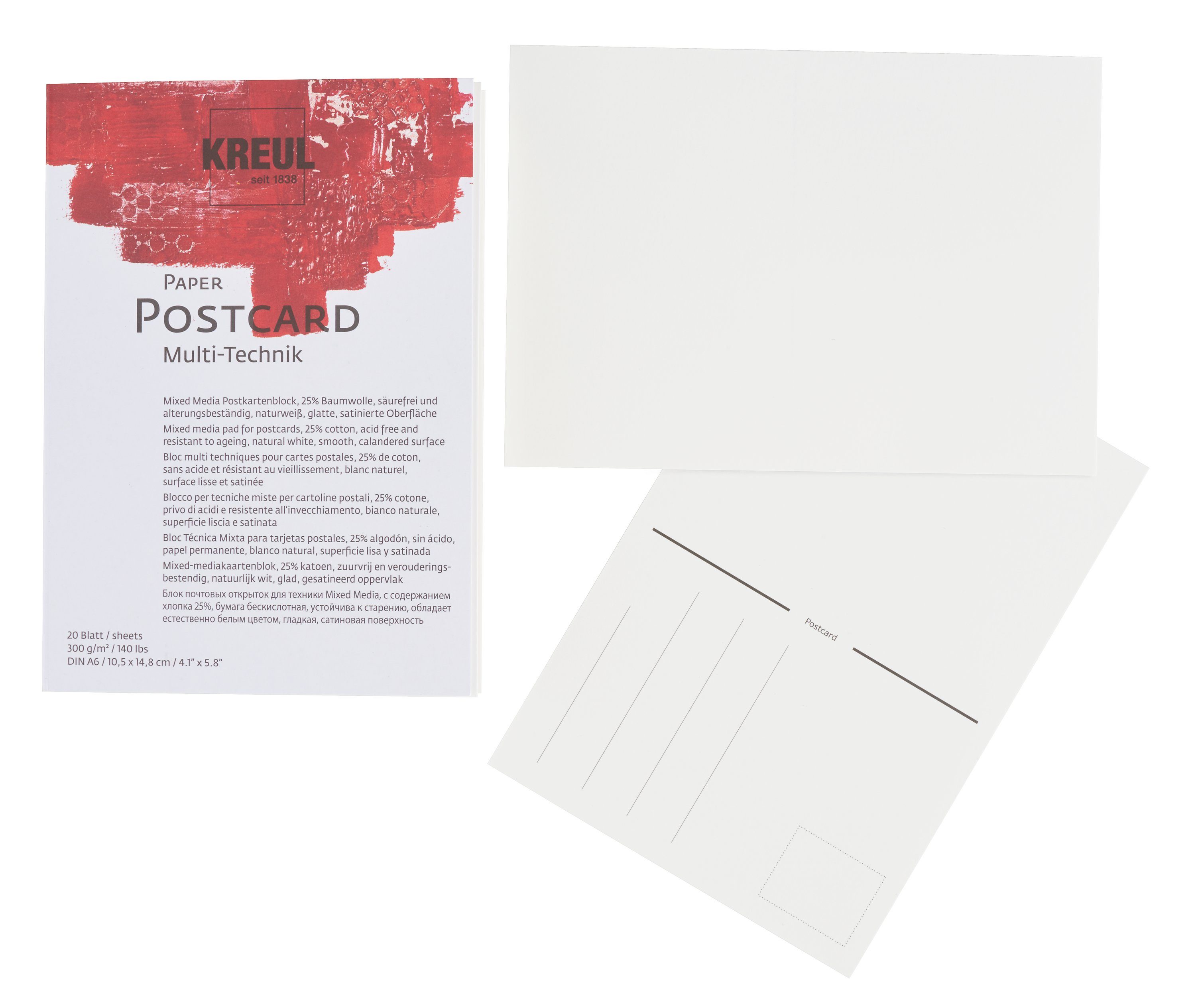 Kreul Paper Postcard mit einem Format von DIN A6 und einem Papiergewicht von 300 g/qm. Das Papier ist eine Mischung aus 25 % Baumwolle und ligninfreier Zellulose. Es ist säurefrei und alterungsbeständig. Die Farbe ist Naturweiß mit einer satinierten, glatten Oberfläche. Für Mixed Media Fine Art Techniken als Nass- und Trockenmaltechnik. Ein tolles Künstlerpapier das vierseitig geleimt ist und sich nach dem Anfeuchten nicht wellt.