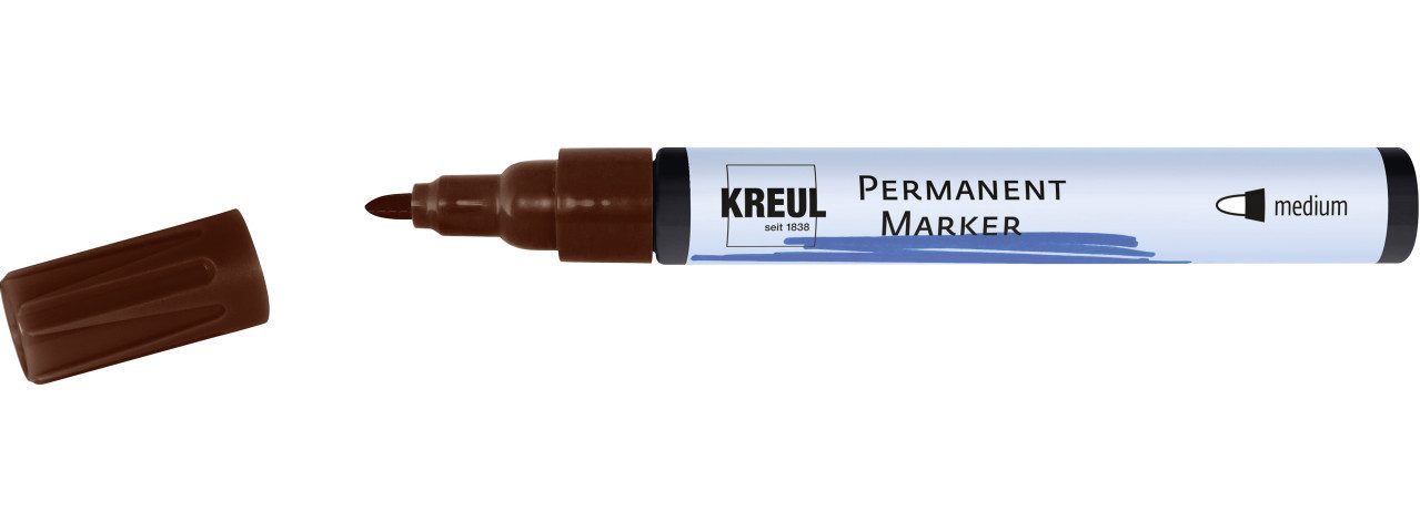 Mit dem Kreul Permanent Marker gelingen Beschriftungen auf verschiedenen Untergründen wasser- und wischfest. Die Farbe hält auf Papier, Folie, Glas, Gummi, Stein und vielem mehr. Ein perfekter Allrounder im Büro, Haushalt oder auf dem Schreibtisch von Kreativen.