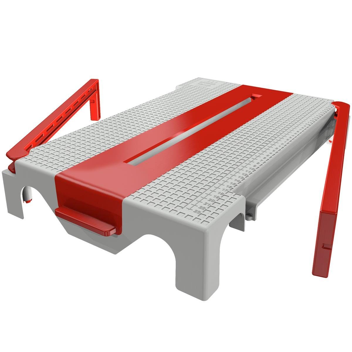 Der Auflagekörper mit vier stabilen Füßen an den Ecken sichert festen Stand. Zusätzlich sind zwei Abstützungselemente mittig an der Unterseite angeordnet. So wird einer Durchbiegung entgegengewirkt und ein sicherer Stand gewährleistet. Diese Elemente sind zwei Millimeter kürzer als die Eckfüße, was ein „Wackeln“ verhindert. Zusätzlich ist zur Stabilisierung unterseitig ein Rippensystem angebracht.