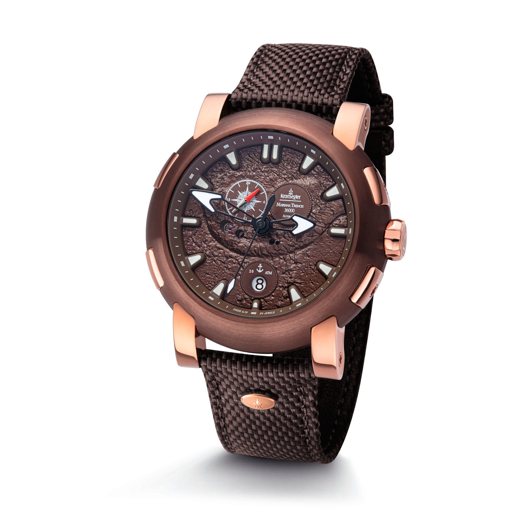Das aufwendige 10-teilige Stahlgehäuse mit ionenplattierter brauner Lünette misst einen Durchmesser von ca. 46mm und eine Dicke von ca. 14mm und hat die Form einer Taucherkapsel. Der geschraubte Stahlboden trägt die eingravierten Daten des Marianengrabens. Ein Glasfenster gibt den Blick auf die Unruh des Uhrwerks frei. Die großen, mit Superluminova gefüllten Zeigerspitzen und Indexe ermöglichen selbst unter Wasser eine gute Ablesbarkeit. Die MARIANA TRENCH ist mit ihrer verschraubten Krone, starkem Saphirglas, massivem Gehäuse sowie 8fach geschraubtem Boden für Tauchtiefen bis 20 ATM Prüfdruck geeignet.