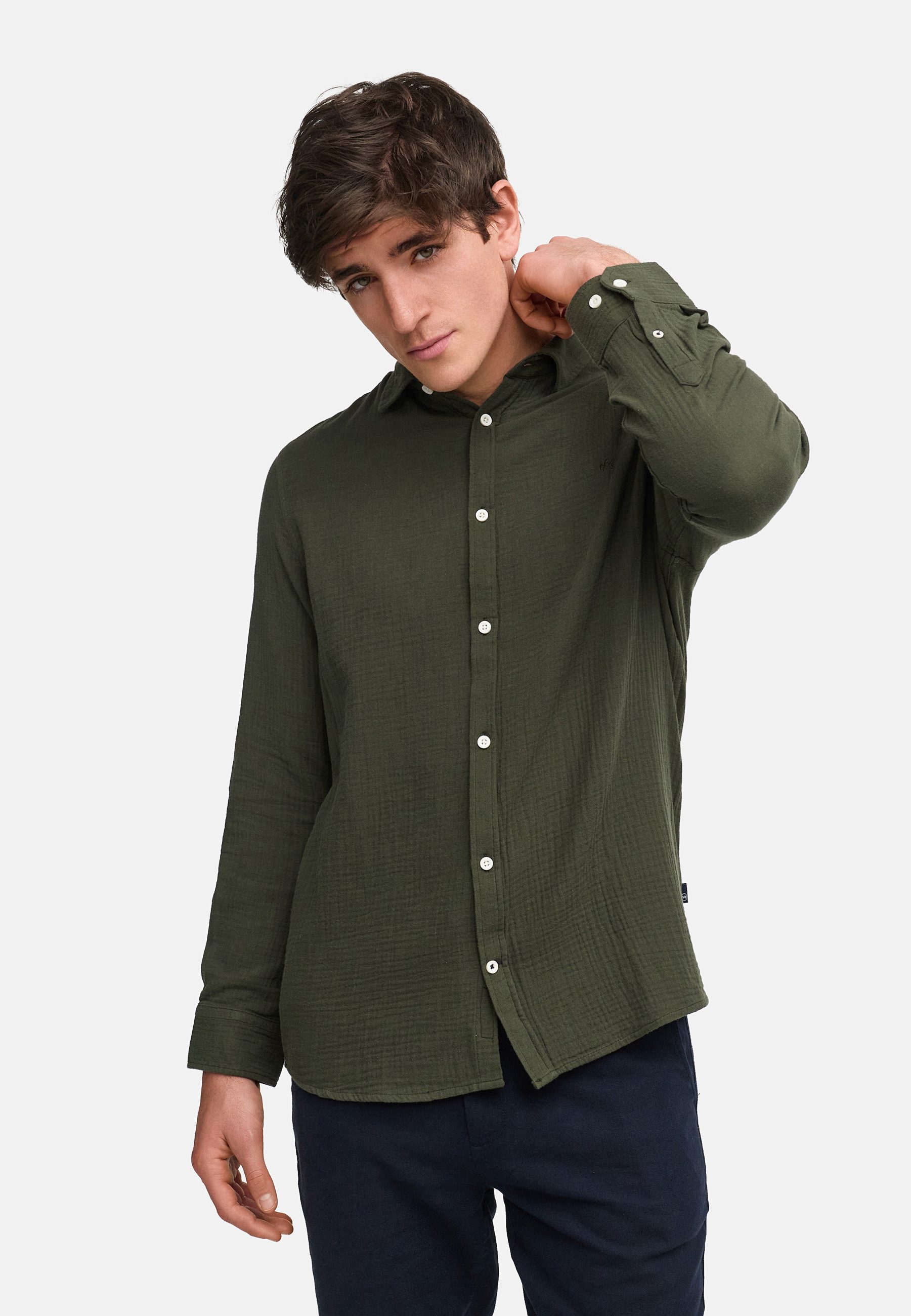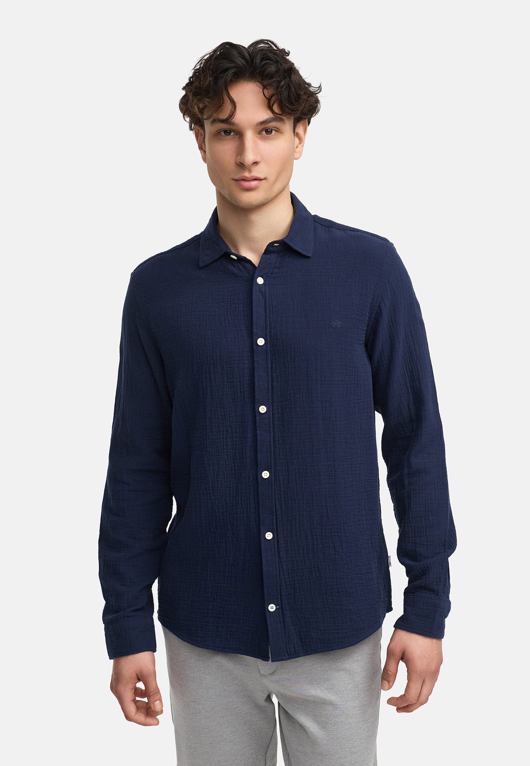 Dieses stilvolle Langarmhemd kombiniert lässigen Komfort mit zeitloser Eleganz. Hergestellt aus einem angenehm leichten, strukturierten Musselin-Baumwollstoff bietet es optimale Atmungsaktivität – perfekt für wärmere Tage oder entspannte Layering-Looks. Die feine Crinkle-Struktur sorgt nicht nur für ein besonderes Tragegefühl, sondern verleiht dem Hemd auch eine dezente, moderne Textur. Der klassische Kentkragen, die durchgehende Knopfleiste und die anliegenden Manschetten mit Knopfverschluss unterstreichen das hochwertige Design.