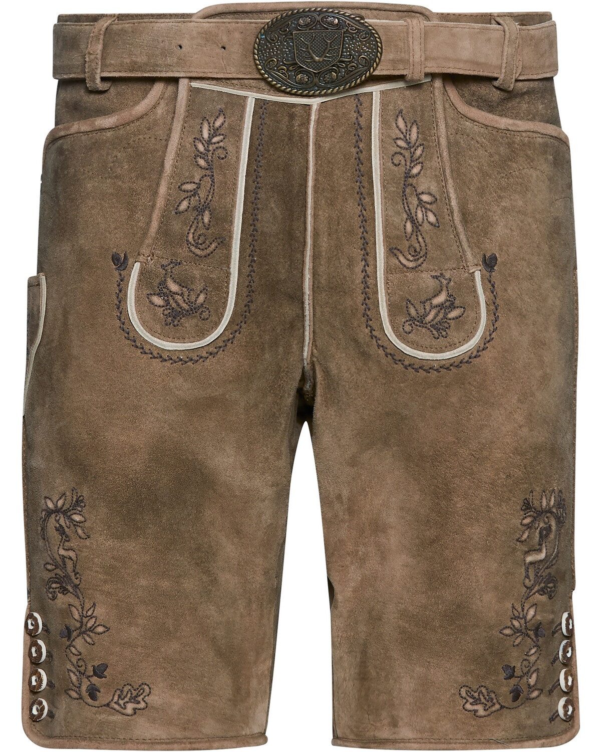 Die Herren Trachtenlederhose von Krüger Buam ist ein zeitloses Kleidungsstück, das aus hochwertigem Ziegenveloursleder gefertigt ist und sowohl Komfort als auch Robustheit bietet. Die feine Verarbeitung und das edle Material sorgen dafür, dass die Hose nicht nur gut aussieht, sondern auch langlebig ist. Traditionelle Stickereien verleihen der Lederhose einen authentischen Look und unterstreichen die Liebe zum Detail, die in jedes Stück eingeflossen ist. Praktische Schubtaschen und eine spezielle Messertasche bieten ausreichend Platz für wichtige Utensilien, während die geknöpfte Gesäßtasche zusätzlichen Stauraum bietet. Die Schnürung am rückseitigen Bund ermöglicht eine individuelle Anpassung und sorgt für einen bequemen Sitz. An den Beinenden befinden sich ebenfalls Knöpfe, die dem Design eine klassische Note verleihen und die Funktionalität der Hose erweitern. Ein passender Gürtel mit Koppelschließe ist im Lieferumfang enthalten, was das Gesamtpaket abrundet und für einen stimmigen Look sorgt. Diese Trachtenlederhose ist ideal für festliche Anlässe sowie für gesellige Zusammenkünfte und bringt die bayerische Tradition auf moderne Weise zum Ausdruck. Ein unverzichtbares Kleidungsstück für jeden Trachtenliebhaber. Oberstoff: 100% Leder. Hinweis zur Passform: Bitte beachten Sie, dass die Hose bei der Anprobe zugehen muss, jedoch nicht bequem sitzen soll. Denn wenn sie schon bei der Anprobe bequem ist, wird sie nach mehrmaligem tragen zu groß sein! Leder ist ein Naturprodukt - so weitet sich die komplette Hose beim Tragen noch.