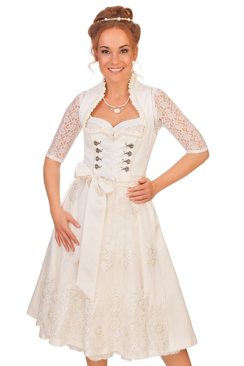 Mit diesem fabelhaften Hochzeitsdirndl ist jede Braut eine Prinzessin an ihrem besonderen Tag. Das Mieder besteht aus royalem Jacquardstoff mit königlichem Ornament-Webmuster. Der elegante Stehkragen und der verführerische Herz-Ausschnitt werden von feiner Rüsche, edler Posamenten- und schimmernder Perlenborte umrahmt. Die fantastischen, altsilbernen Miederhaken sind mit funkelnden Strasssteinen besetzt und halten das glänzende Satinschnürband. Teilungsnähte und Armausschnitte sind schön abgepaspelt, zudem zieren Borten aus kleinen Perlen die vorderen Teilungsnähte. Vorn hat das Mieder einen Reißverschluss mit dezentem Zipper. Der schöne Rock, wundervoll fließend in A-Linie, besteht aus leicht schimmerndem Brautsatin mit zartem Pünktchen-Streifen-Webmuster. Den Rocksaum schmückt eine niedliche Schleifenborte. Der integrierte Unterrock aus Tüll ist im unteren Bereich mit hauchfeinen Rüschen bestückt. Das Hochzeitsdirndl wird mit zwei Schürzen geliefert; beide Schürzen haben ein bezauberndes Schürzenband aus Brautsatin, edel gewebt mit zartem Polka Dot-Streifen-Muster. Die himmlische Brautsatin-Schürze im Pünktchen-Streifen-Stil ist für einen tollen Faltenwurf am Bund gehanselt und mit glänzenden Perlen verziert. Eine zarte Schleifenborte veredelt den Schürzensaum. Das Schürzenband dieser Schürze ist zudem an den Enden mit einer Perlenborte verschönert. Die prachtvolle, am Bund traumhaft geraffte Tüllschürze ist mit wundervollen Ornamenten bestickt sowie mit feinen Perlen in Perlmutt und kleinen Röhrenperlen in Silber geschmückt. Der wellenförmige Schürzensaum ergibt einen tollen Abschluss. Das wundervolle Hochzeitskleid zum Träumen nennt sich Annelieb und stammt von der Marke Krüger Collection. Beachten Sie bitte den Übergrößenzuschlag ab Размер 48. Im Lieferumfang ist das Midi Dirndl mit den beiden Schürzen enthalten; die Bluse, die Accessoires und ein Petticoat sind nicht inbegriffen.
