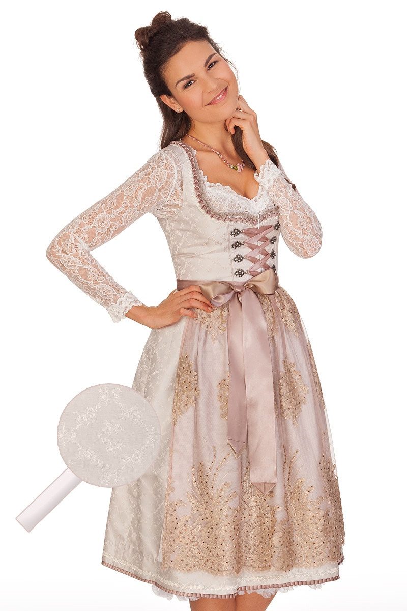 Das royale Midi Dirndl Charlotte aus edel schimmerndem Brokat im exklusiven allover Ranken-Webmuster ist auserkoren zur Königin der Tracht! Das majestätische Mieder verführt mit seinem leicht herzförmigen Unterbrustausschnitt, umrahmt von liebreizender Herzerl-Rüsche und edlen Posamentenborten. Die prunkvollen Blumen-Miederösen sind mit funkelnden Swarovskisteinen besetzt und komplettiert mit einem eleganten Satinbindeband im adretten Farbton. Das Mieder ist sauber abgefüttert und die Teilungsnähte und Armausschnitte schön abgepaspelt. Geschlossen wird das Dirndl vorn mit einem dezenten Reißverschluss mit schmalen Zipper. Der traumhaft schwingende Rock ist in breite Kellerfalten gelegt. Am Rocksaum befinden sich eine herrliche Rüsche und Posamentenborte. Auf der rechten Seite sitzt eine Eingrifftasche. Das wundervolle Satin-Schürzenbindeband besteht aus zwei Stofflagen in farblich abgesetzten Farbtönen und zaubert eine traumhafte Taille. Prachtvoll ist auch die zweifache Schürze. Die untere Schürze besteht aus glänzenden Brokat mit einem zarten Rautenwebmuster. Die obere Schürze ist ein Traum aus Spitze mit floraler Lurexstickerei, verfeinert mit funkelnden Strasssteinen, abgestimmt mit einem geschwungener Schürzensaum. Dieses atemberaubende Festdirndl ist ein Meisterstück der Marke Krüger Collection. Im Lieferumfang sind Midi Dirndl und Schürze enthalten; Bluse und Petticoat sind nicht inbegriffen.