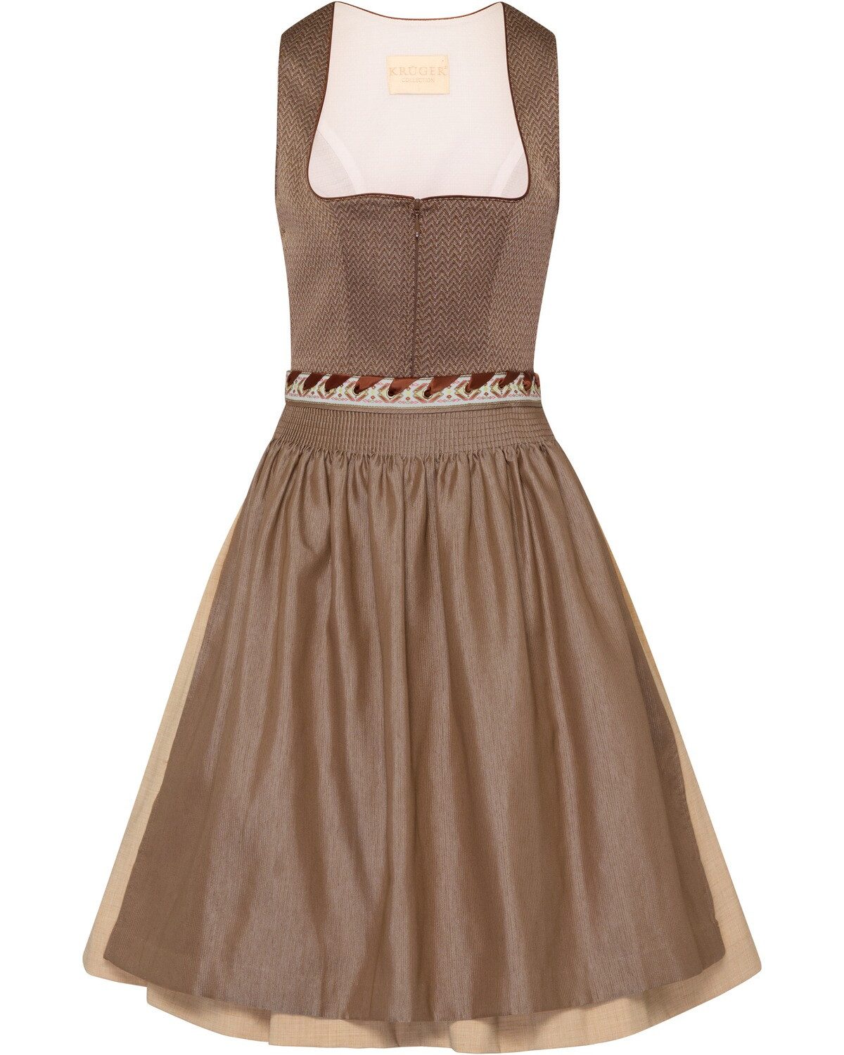 Das Midi Dirndl von Krüger Collection vereint traditionelle Eleganz mit modernem Design. Das strukturierte Mieder besticht durch einen ansprechenden Balkonett-Ausschnitt, der eine feminine Silhouette betont. Der praktische Reißverschluss in der vorderen Mitte sorgt für eine bequeme Handhabung und ermöglicht ein einfaches An- und Ausziehen. Der Rock in kontrastierender Farbe setzt einen lebhaften Akzent und verleiht dem Dirndl eine frische Note. Mit zwei integrierten Schubtaschen bietet das Kleid nicht nur Stil, sondern auch Funktionalität, ideal für festliche Anlässe oder gesellige Veranstaltungen. Die Kombination von Komfort und modischem Ausdruck macht dieses Dirndl zu einem zeitlosen Begleiter. Abgerundet wird das Gesamtbild durch die farblich abgestimmte Schürze, die mit einem gemusterten Schürzenband verziert ist. Diese liebevollen Details verleihen dem Midi Dirndl eine besondere Note und unterstreichen die handwerkliche Qualität von Krüger Collection. Ein Kleidungsstück, das sowohl Tradition als auch Stil verkörpert und in keiner Garderobe fehlen sollte. Oberstoff: 88% Polyester, 5% Wolle, 4% Viskose, 3% Elasthan; Futter: 100% Baumwolle; Sonstige Materialien: Schürze, 58% Polyester, 42% Baumwolle